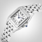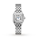 Panth??re de Cartier watch, small model, quartz movement. Case in steel, dimensions: 22 mm x 30 mm, thickness: 6 mm, crown set with a synthetic blue spinel, silvered dial, blued-steel sword-shaped hands, steel bracelet, water-resistant to 3 bar (around 30 metres). At once a watch and jewel, the Panth??re de Cartier timepiece is one of the most distinctive Cartier designs. Born in the 80s and more contemporary than ever, it is a true style icon for women who wish never to go unnoticed. Explore the full Cartier range here.