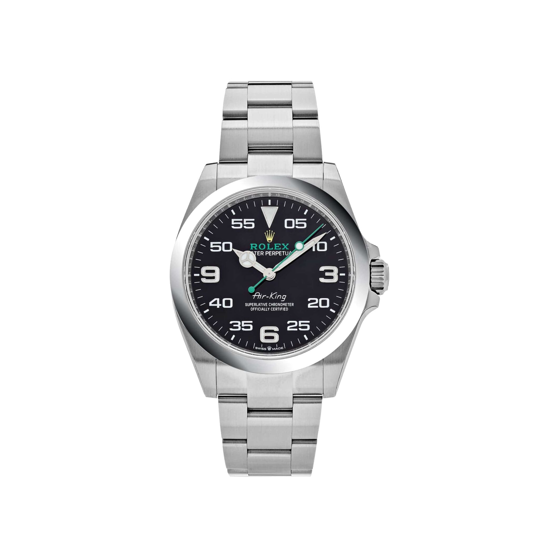 The name, Air-King is engraved in its center encompassed by luminous white numerals and hands. This solid wristwatch is housed on an exquisite Oyster bracelet with flat three-piece links.