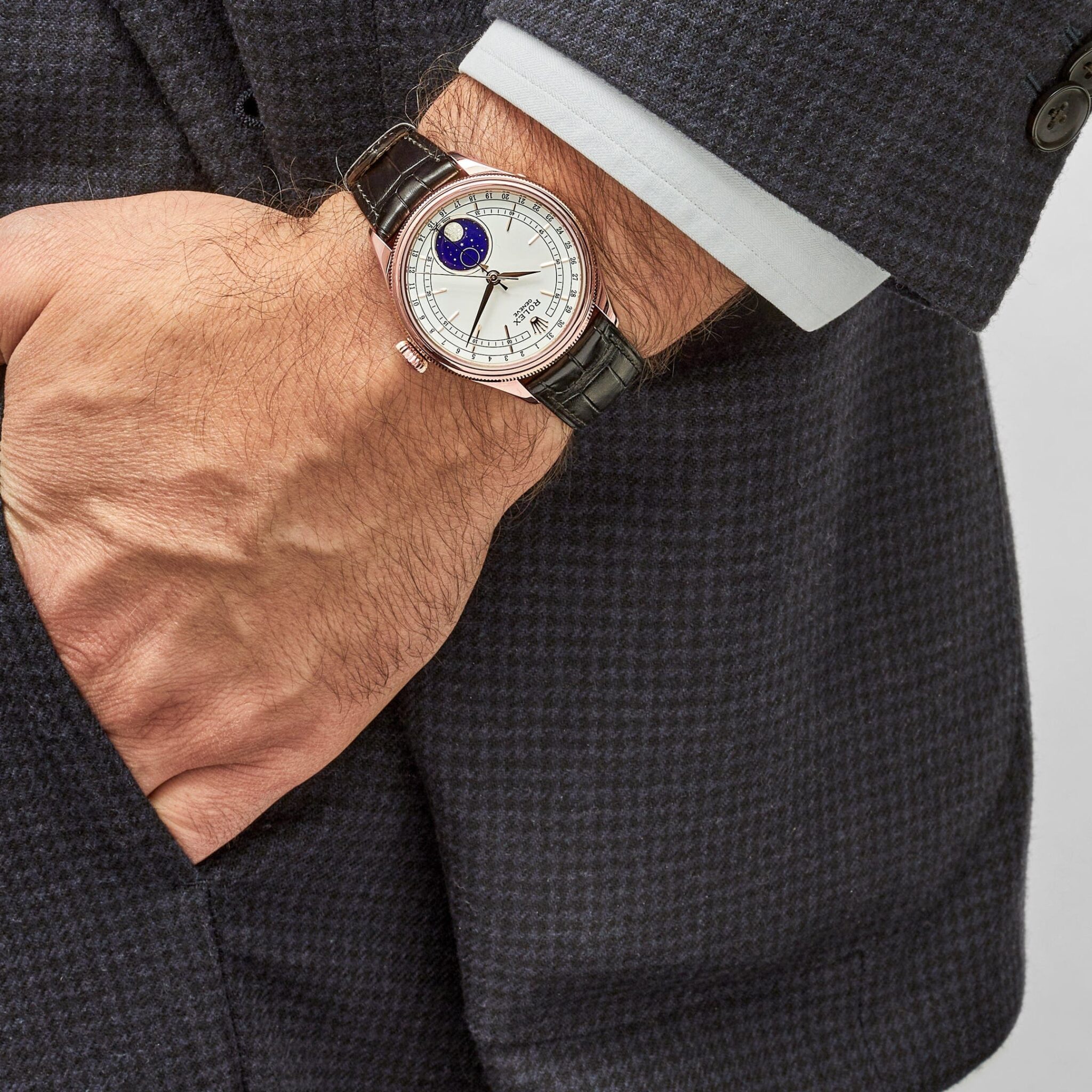 The white lacquered dial is beautifully balanced, showcasing a striking moon phase display at 6 o??clock, accented by an enameled blue moon and a meteorite moon disc. A central date hand with a crescent-shaped tip circles the outer dial, while applied rose gold hour markers and hands enhance its refined aesthetic.