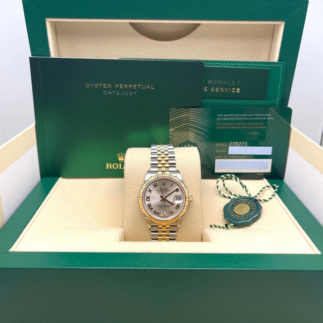 As part of the iconic Datejust collection, the 278273 includes the signature date window at 3 o??clock, magnified by Rolex??s Cyclops lens for superior readability. Paired with the renowned Jubilee bracelet, known for its five-piece link construction and exceptional comfort, the Datejust 278273 combines style, luxury, and practicality seamlessly.