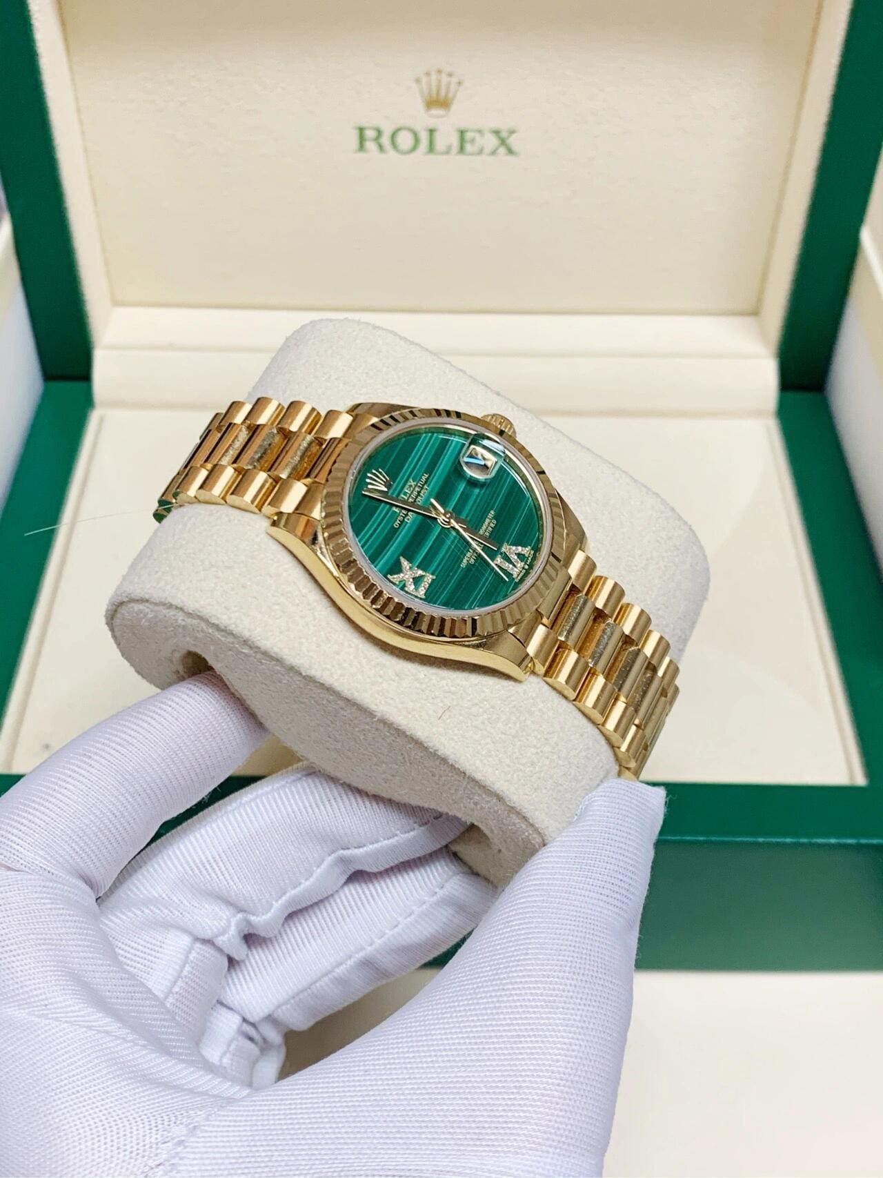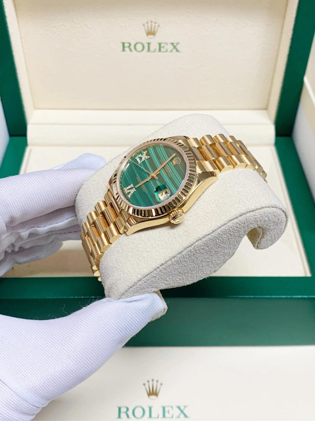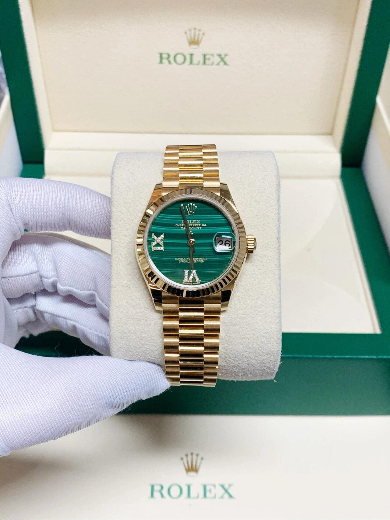 The Rolex 31 278278?in yellow gold with a malachite diamond dial is a striking ladies?? timepiece that merges natural artistry with refined craftsmanship. The vivid green malachite dial??each one unique due to its natural striations??is adorned with brilliant-cut diamond hour markers set in 18k gold and a diamond-set Roman VI, adding a regal touch to its aesthetic.