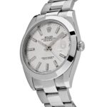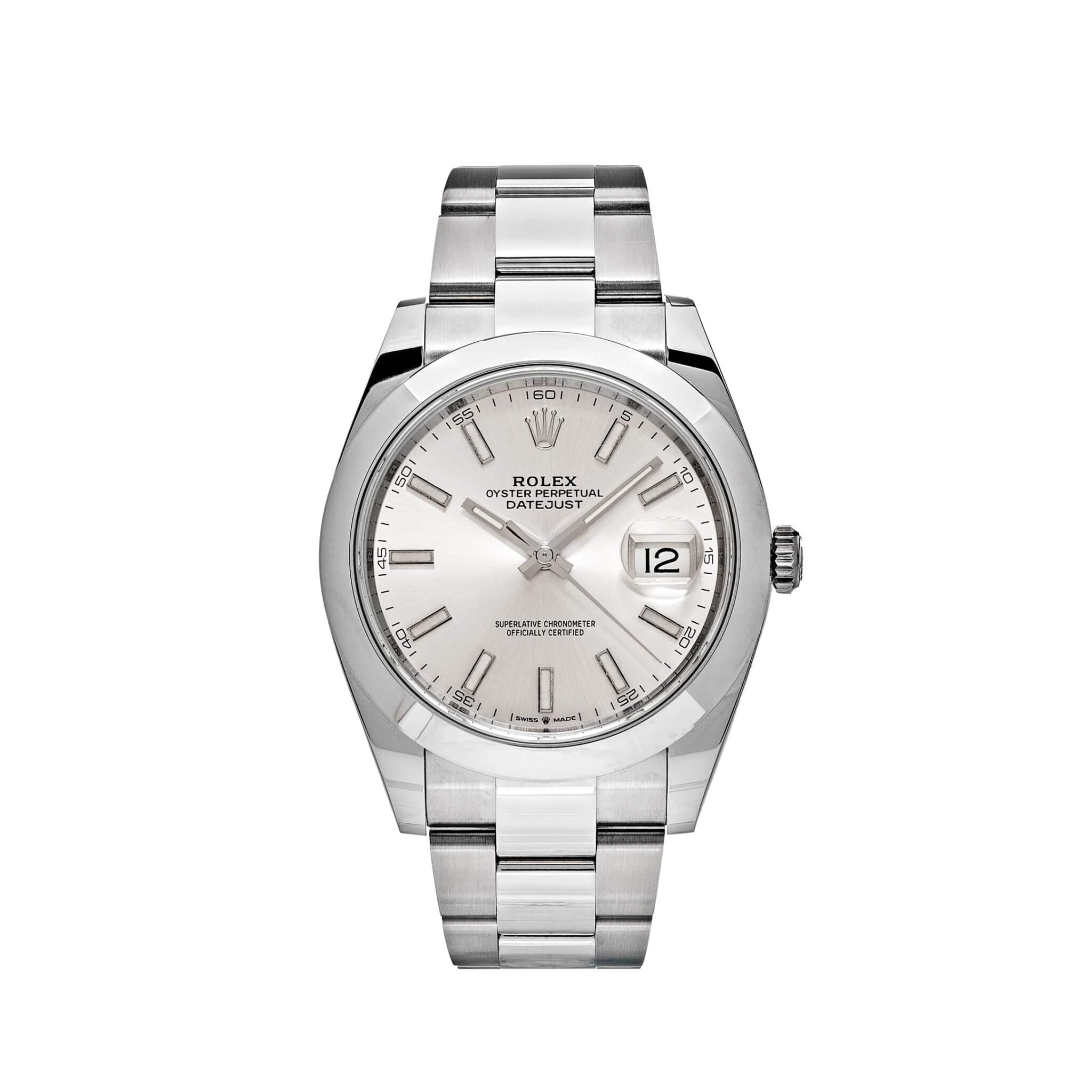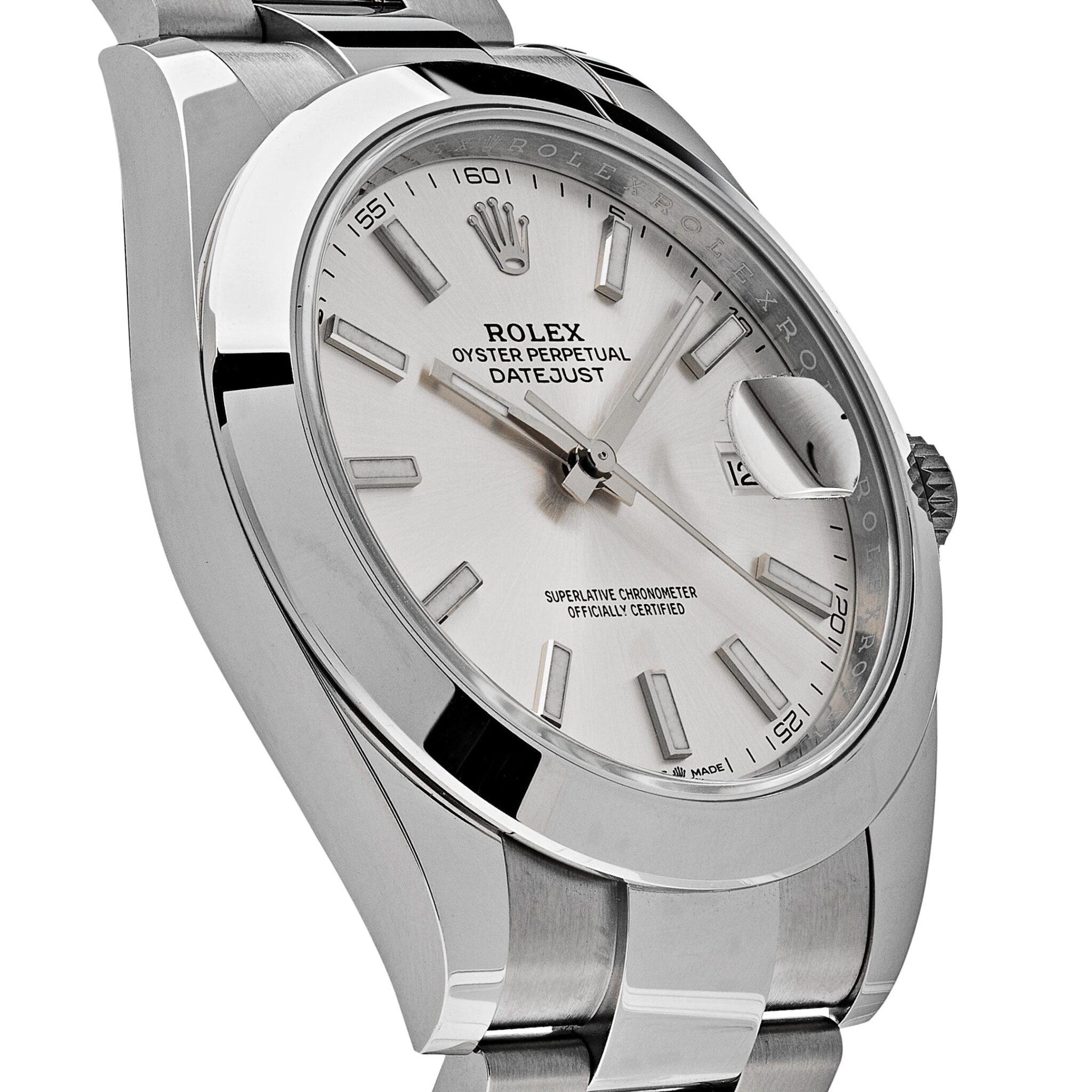 The Rolex 41 126300 is a classic and versatile timepiece crafted in stainless steel with a 41mm Oyster case and a smooth bezel for a clean, modern look. Its understated silver dial is complemented by luminous baton hour markers and the iconic Cyclops lens over the date window at 3 o??clock.