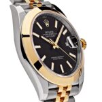 The Rolex 126303 is a striking blend of luxury and versatility, combining stainless steel and 18k yellow gold in its robust 41mm case. The elegant black dial serves as the focal point, featuring luminous baton hour markers and a date window at 3 o??clock, magnified by Rolex??s signature Cyclops lens for enhanced readability.