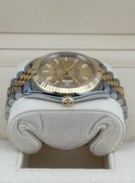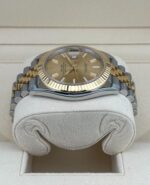 The Rolex is designed with a 41mm stainless steel case, highlighted by the signature 18k yellow gold fluted bezel. It features an elegant champagne color dial with luminous hour markers and white gold hands with a date display at 3 o’clock, protected by a scratch-resistant sapphire-crystal. On the wrist the 18k white gold and stainless steel jubilee bracelet is a true beauty.