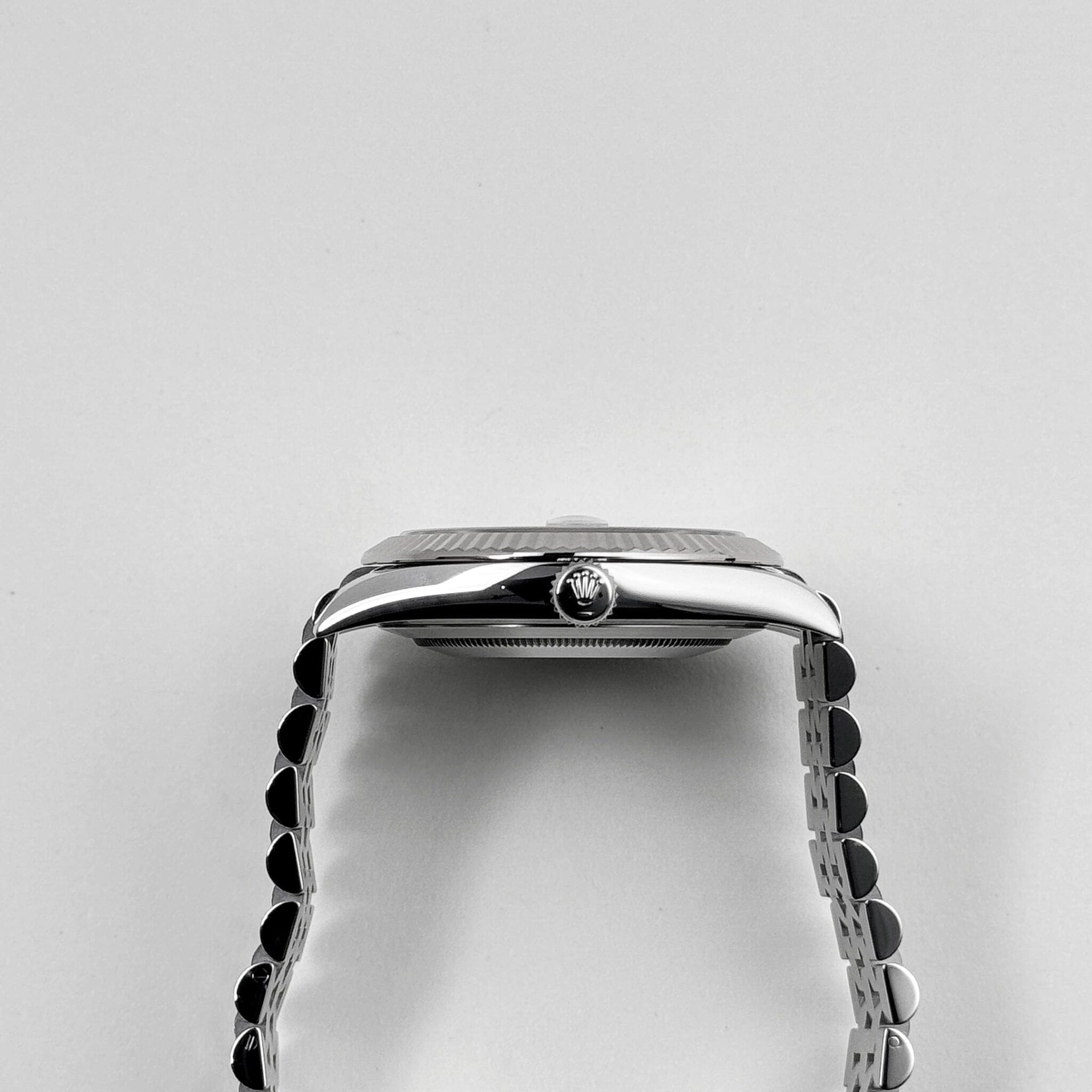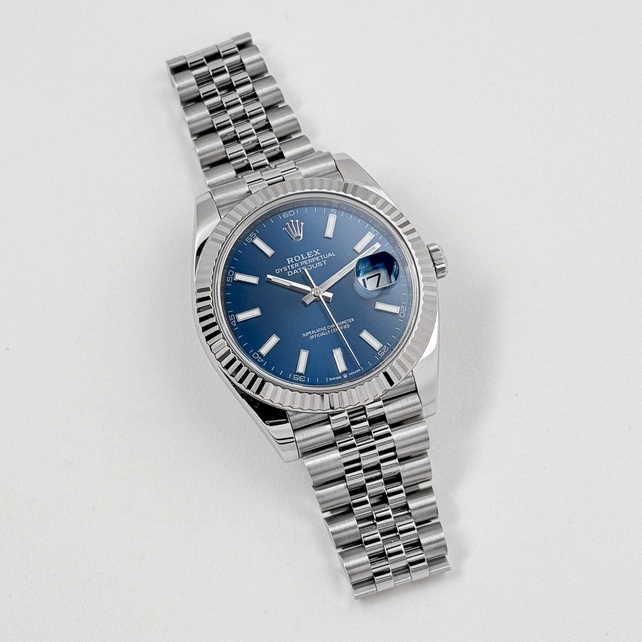 The Rolex ?126334 in stainless steel with a blue sunray dial and Jubilee bracelet is a modern classic that blends timeless design with contemporary refinement. Housed in a 41mm Oyster case, the watch features an elegant 18k white gold fluted bezel, adding a subtle touch of luxury while remaining versatile for everyday wear.
