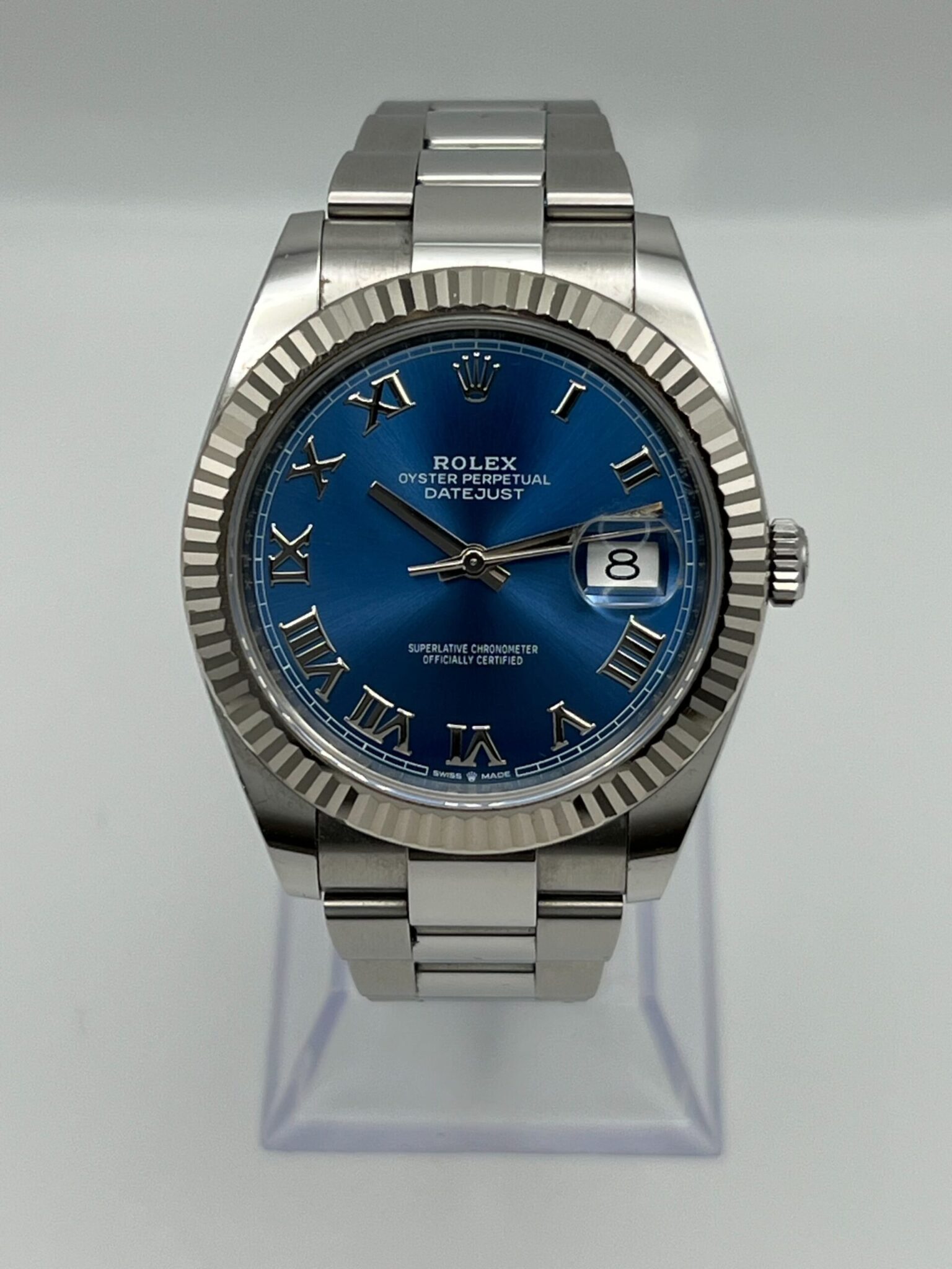 The Rolex 126334 is a sophisticated timepiece that combines timeless design with modern craftsmanship. Featuring a 41mm Oystersteel case, this model is complemented by a white gold fluted bezel, adding a touch of refinement to its versatile aesthetic.