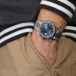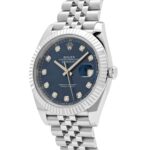 The Rolex 126334 is a stunning combination of elegance and precision, crafted in stainless steel with a 41mm case and a striking 18k white gold fluted bezel. Its captivating blue dial serves as the centerpiece, adorned with factory-set diamond hour markers that exude luxury and refinement.