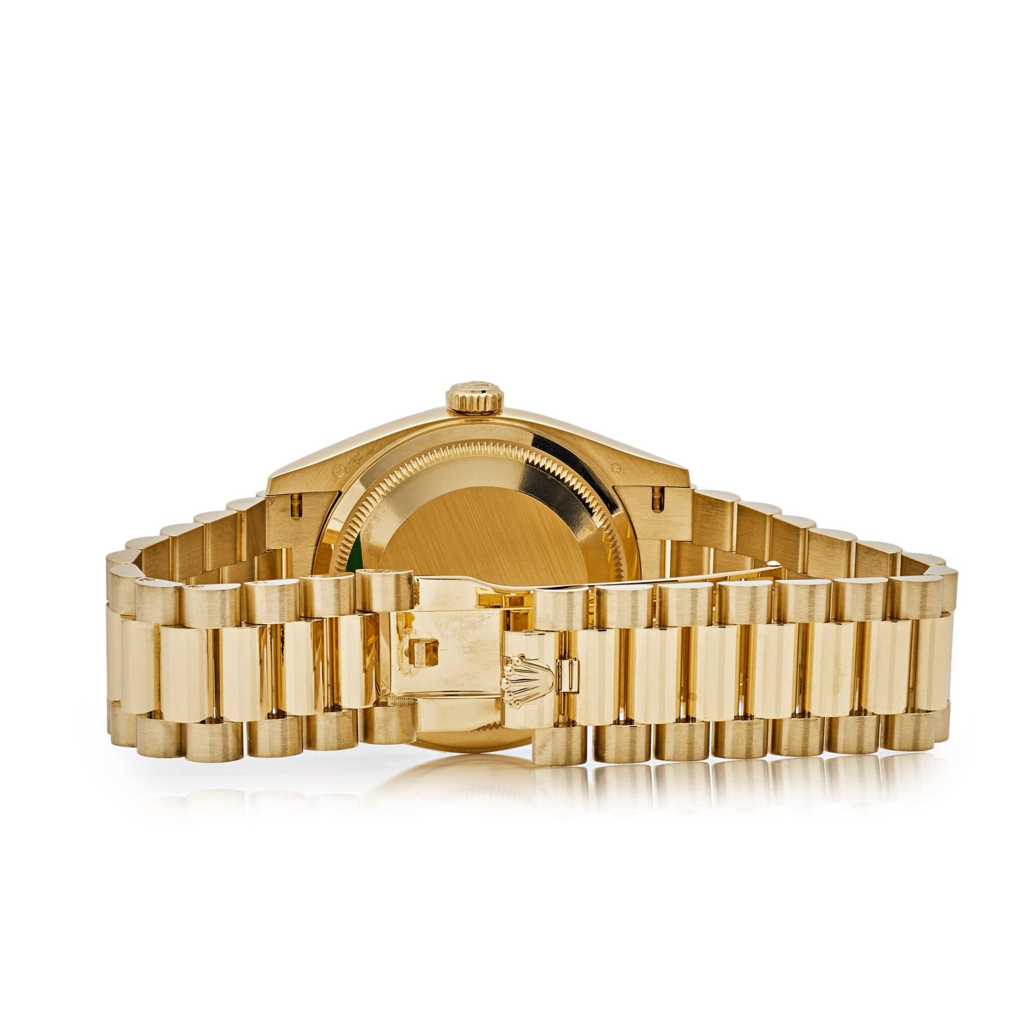 The Oyster Perpetual is inlaid in a sophisticated 36mm 18k yellow gold case surrounding a champagne colored dial. The signature fluted bezel is an aesthetic element and distinctive feature for the Rolex brand. The symbolic 18k yellow gold presidential bracelet includes semi-circular three-piece links and concealed Crownclasp, being the most sought-out timepiece to date.