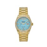 The turquoise dial is the centerpiece of this exquisite watch, featuring a vibrant hue that is beautifully complemented by diamond hour markers set in yellow gold. The signature day display at 12 o??clock and the date window at 3 o??clock, magnified by Rolex??s iconic Cyclops lens, maintain the practicality and prestige synonymous with the Day-Date collection. Paired with the prestigious President bracelet, known for its polished three-link construction and unparalleled comfort, this watch is a testament to Rolex??s expertise in creating timeless and luxurious designs. The Day-Date 128348RBR is a coveted choice for collectors who appreciate rare materials and exquisite artistry in horology.
