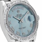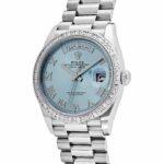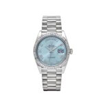 The Rolex 128396TBR is a luxurious take on the classic Day-Date design, crafted from platinum and featuring a captivating ice blue dial. This rare color, exclusive to Rolex??s platinum models, adds a fresh yet refined touch to the timepiece. Encircling the 36mm case is a bezel set with brilliant-cut diamonds, giving the watch an extra layer of elegance and sparkle.