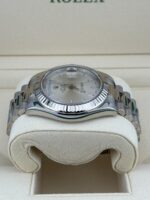 The silver dial, with its understated sunburst finish, is adorned with applied white gold hour markers and hands, offering exceptional legibility and a sophisticated aesthetic. The iconic day display at 12 o??clock and the date at 3 o??clock, magnified by the Cyclops lens, complete its classic layout.