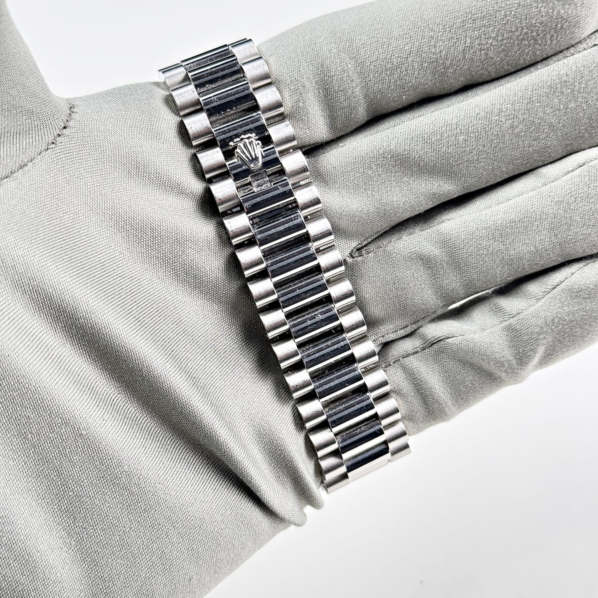 The 40mm platinum case is paired with the signature President bracelet, known for its seamless integration and unparalleled comfort. The dial features Rolex??s hallmark day display at 12 o??clock and date window at 3 o??clock, magnified by the Cyclops lens for easy readability. The smooth platinum bezel completes the elegant aesthetic.