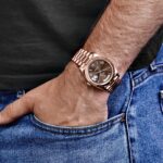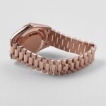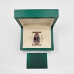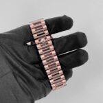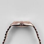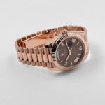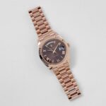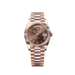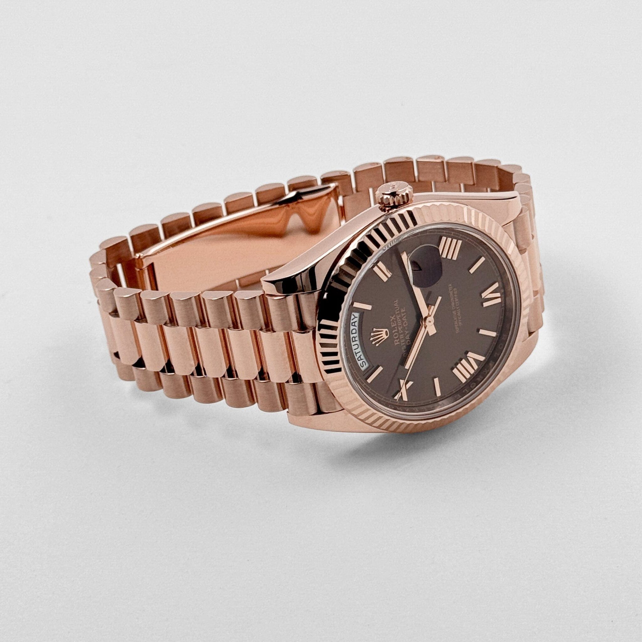 The Rolex 228235 is a timeless masterpiece, crafted in 18k rose gold for a warm and sophisticated presence. Its 40mm case is complemented by a signature fluted bezel, adding a classic touch to the design. The rich chocolate brown dial serves as the focal point, featuring bold Roman numeral hour markers in matching rose gold, offering an elegant contrast and refined aesthetic.