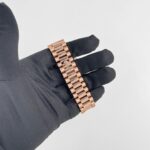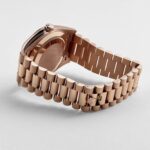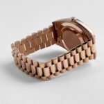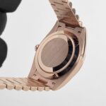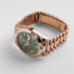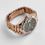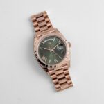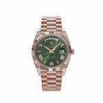 The olive green dial is a standout feature, offering a vibrant and modern twist on the classic Day-Date design. Adorned with rose gold Roman numeral hour markers, the dial achieves a perfect balance of elegance and legibility. The iconic day display at 12 o??clock and the date window at 3 o??clock, magnified by a Cyclops lens, maintain the watch’s signature functionality.