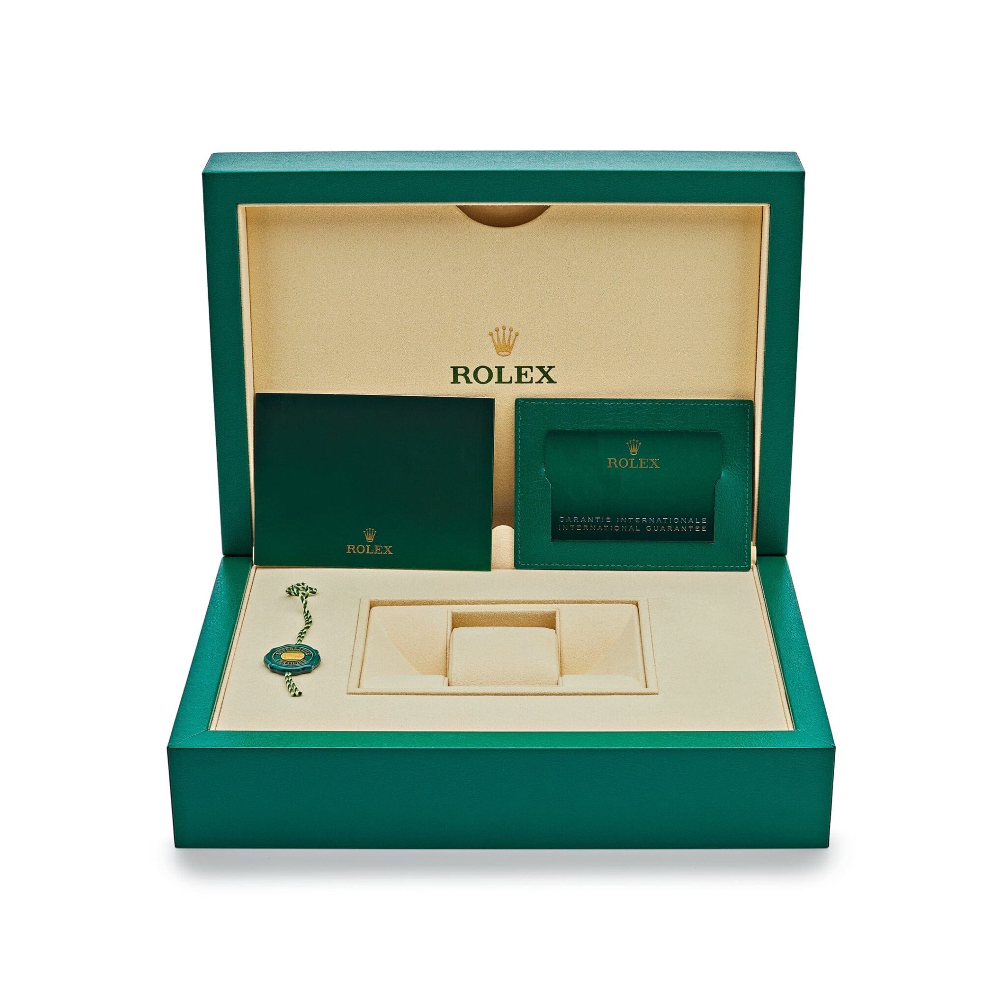 Enhancing the brilliance are diamond hour markers and blue sapphire baguette hour markers at 6 and 9 o??clock, which add a vivid flash of color and further distinguish this reference from other gem-set models. The dial also features the day display at 12 o??clock and date window at 3 o??clock with the iconic Cyclops magnifier, maintaining the timeless identity of the Day-Date line.