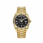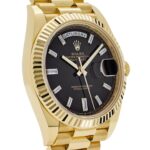 The Rolex 228238 is a striking symbol of elegance and craftsmanship, meticulously crafted in 18k yellow gold. Its 40mm case is complemented by a classic fluted bezel, embodying timeless sophistication. The standout feature is its black lacquered dial, adorned with baguette-cut diamond hour markers that exude understated luxury and brilliance.