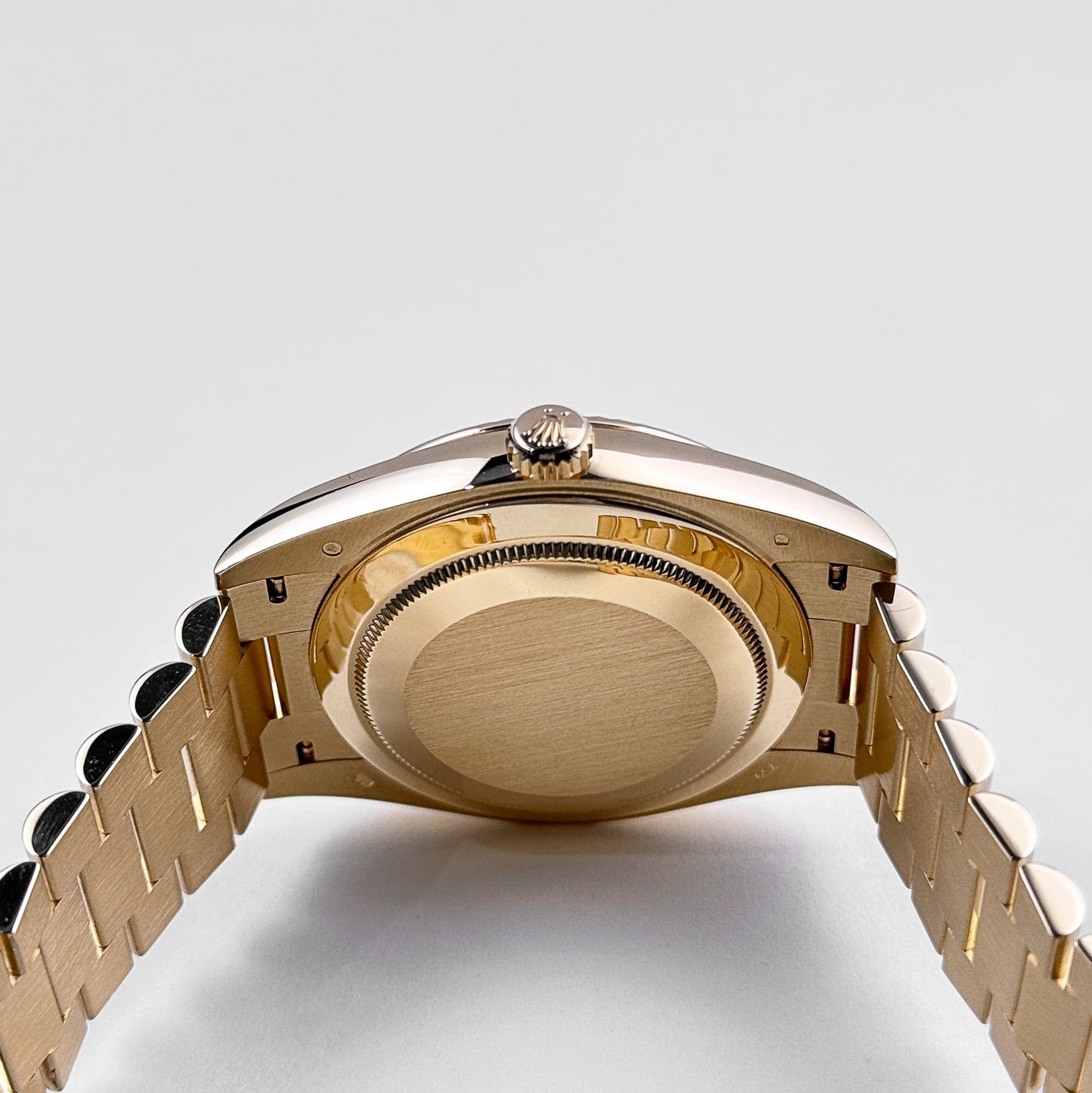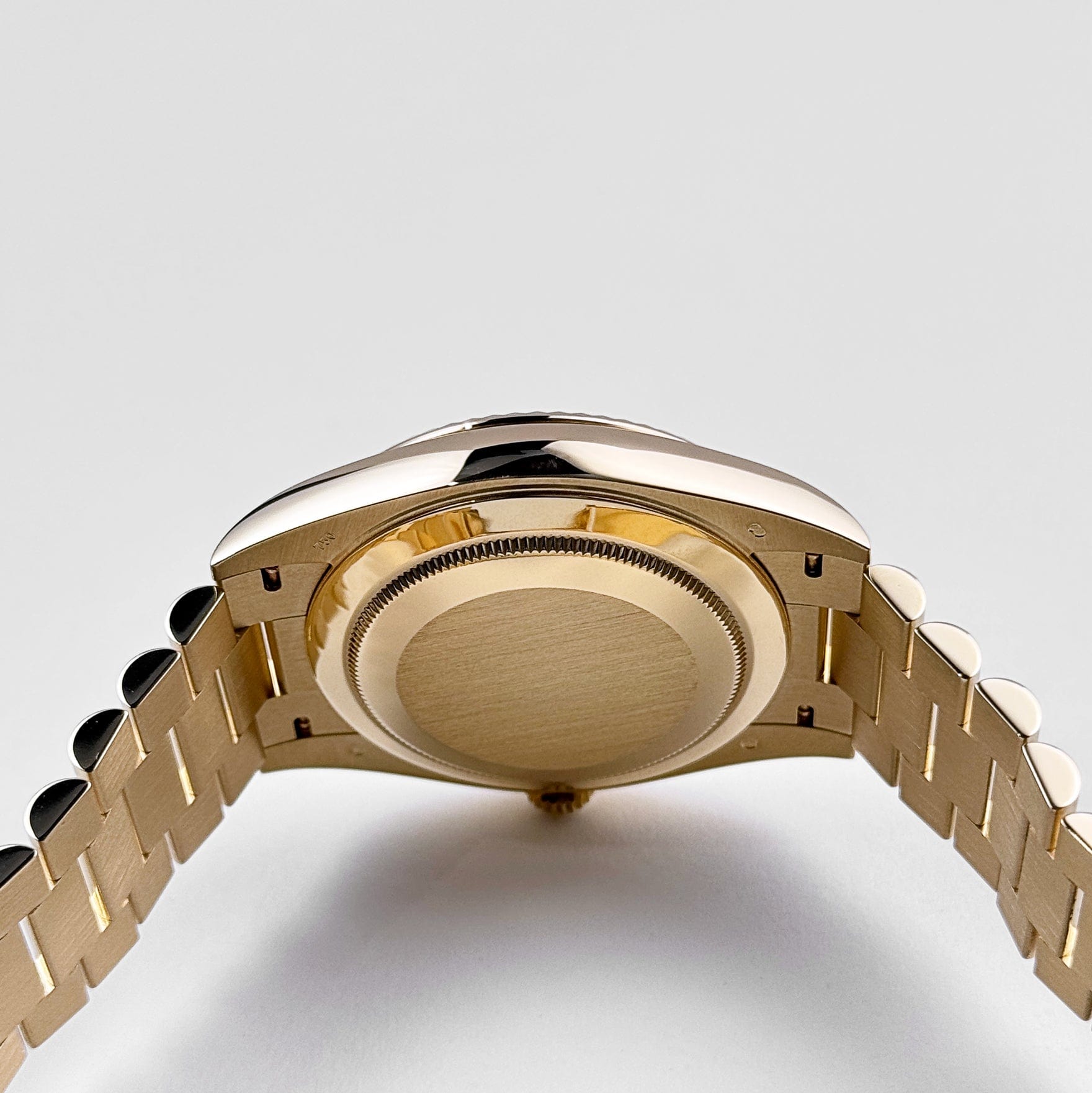 The Rolex 228238 is a timeless expression of Rolex??s legacy in crafting luxurious timepieces. This model features a?40mm 18k yellow gold case, with a polished?fluted bezel, a hallmark of the Day-Date collection that exudes sophistication.