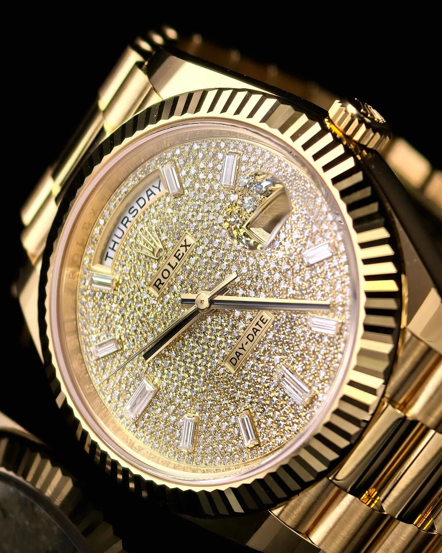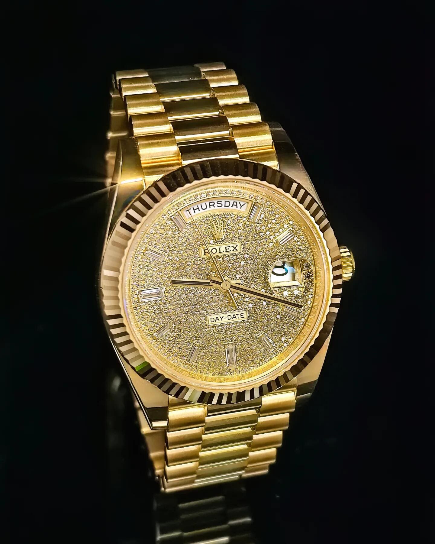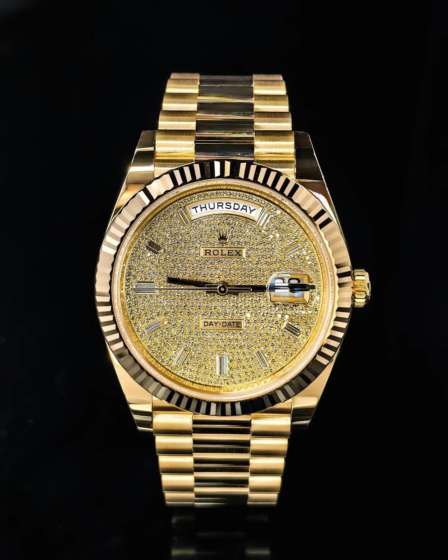 Each hour is marked by a brilliant-cut diamond set in yellow gold settings, further amplifying the watch??s luxurious allure. The iconic day display at 12 o’clock and date window at 3 o’clock??magnified by the Cyclops lens??retain the model??s signature functionality. Paired with the President bracelet, this Day-Date 40 embodies Rolex??s mastery in combining jewelry artistry with timeless design.