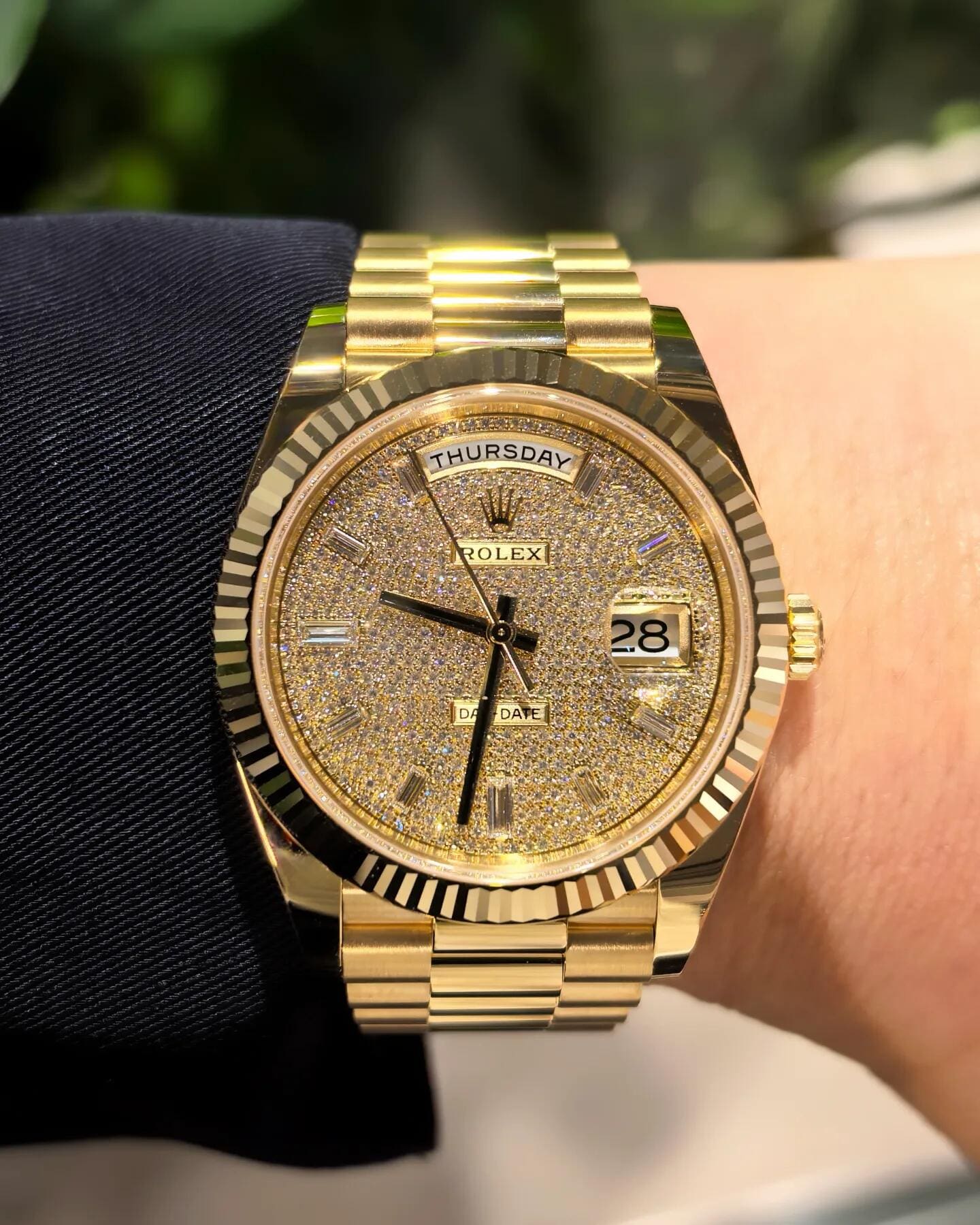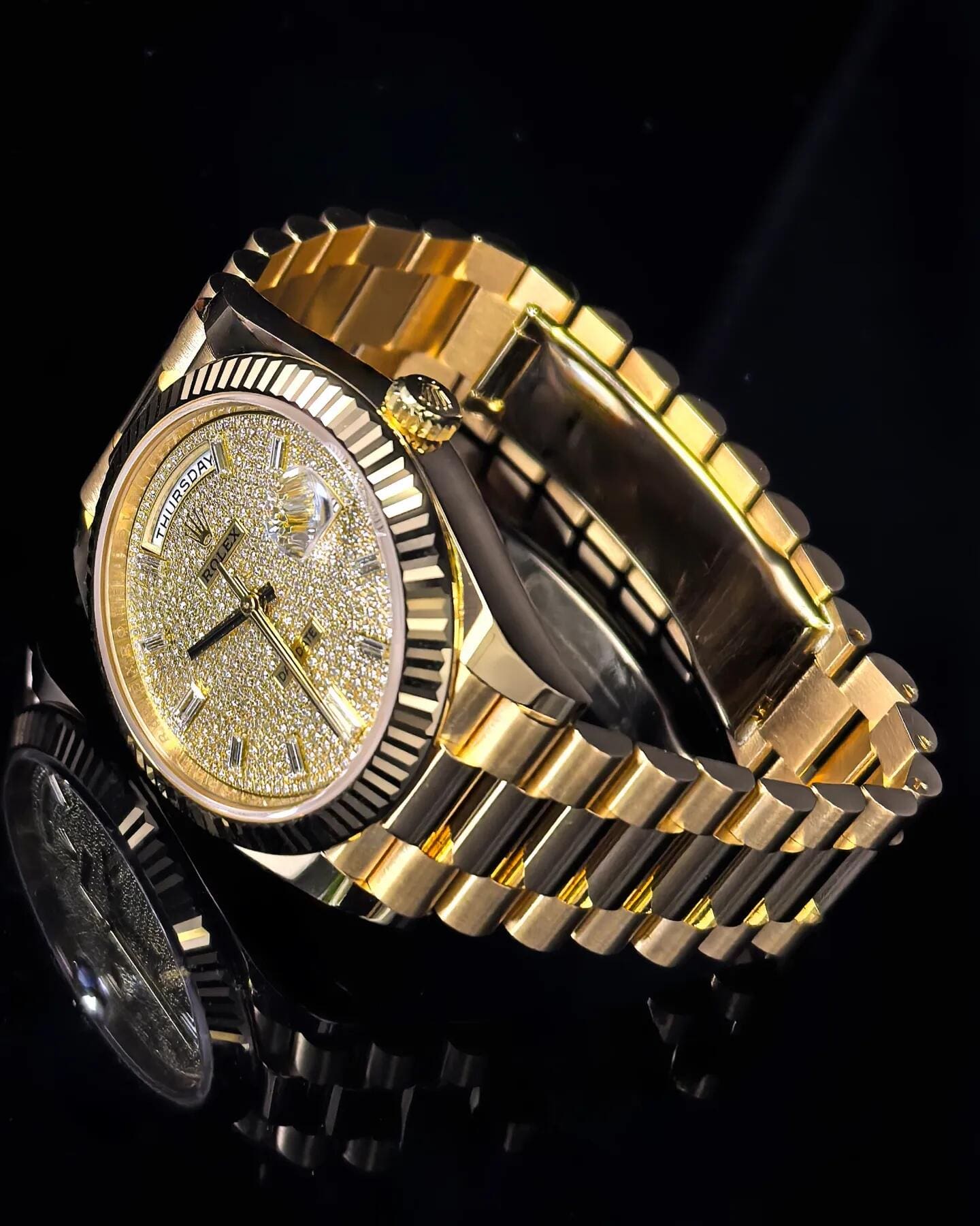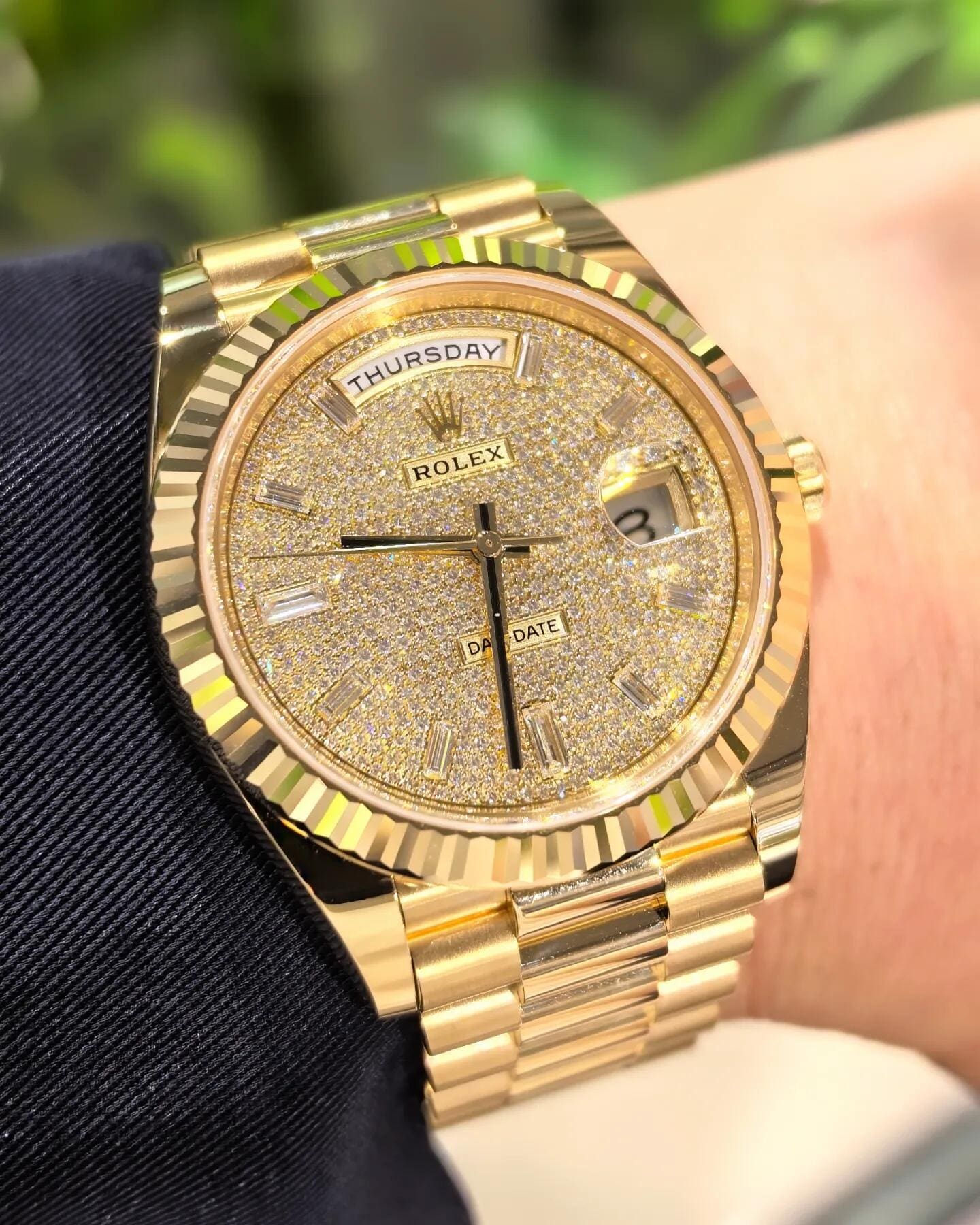 Each hour is marked by a brilliant-cut diamond set in yellow gold settings, further amplifying the watch??s luxurious allure. The iconic day display at 12 o’clock and date window at 3 o’clock??magnified by the Cyclops lens??retain the model??s signature functionality. Paired with the President bracelet, this Day-Date 40 embodies Rolex??s mastery in combining jewelry artistry with timeless design.