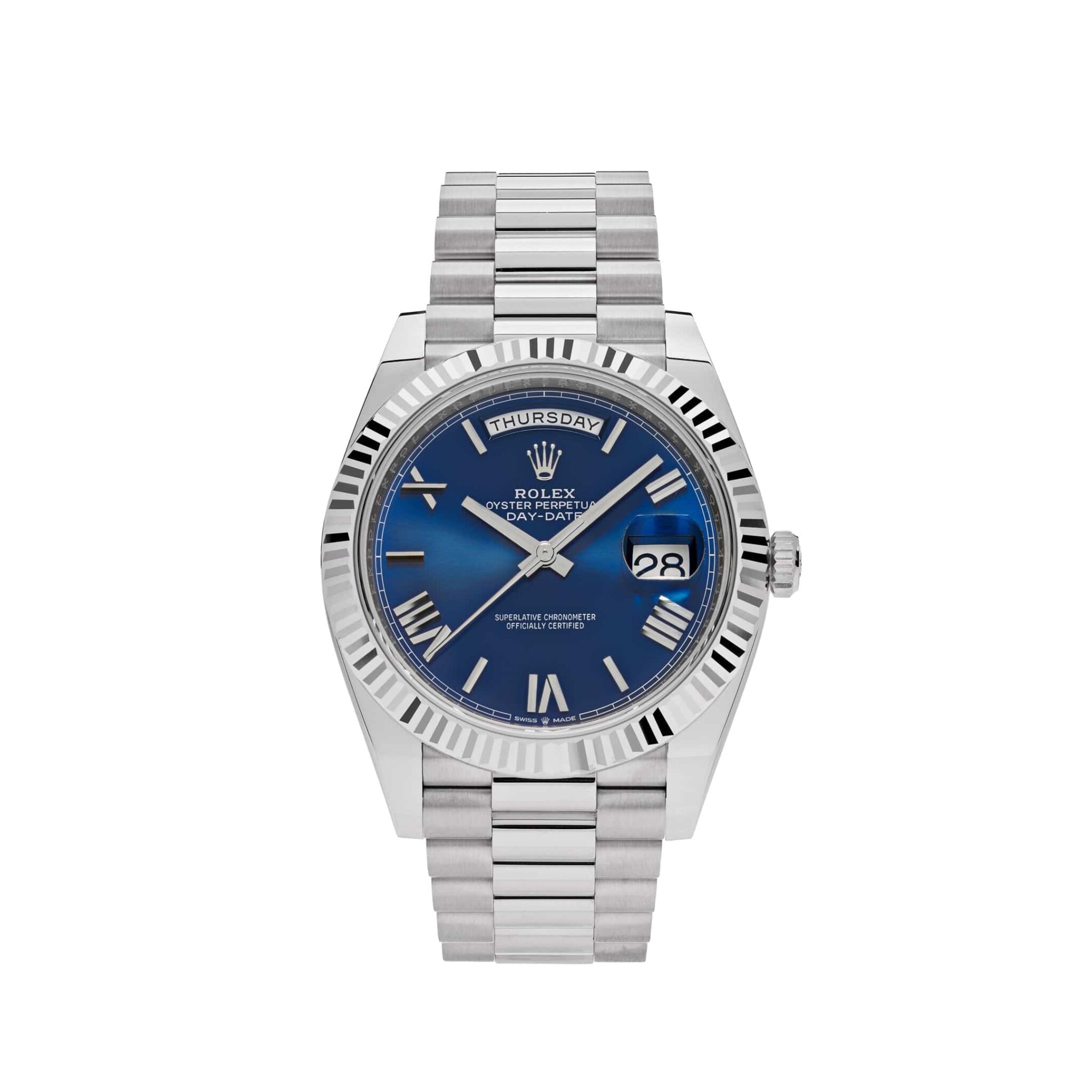The Rolex Presidential 40mm is inlaid in 18ct white gold and designed with a lavish blue dial, roman numeral hour markers, fluted bezel and automatic movement. The signature Presidential bracelet includes, semi-circular three-piece links and embodies excellence and charm.