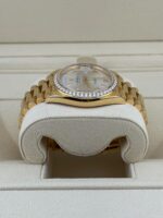 The silver dial enhances the watch’s understated sophistication, featuring applied yellow gold Roman numeral hour markers that provide a harmonious contrast. The day display at 12 o??clock and date window at 3 o??clock remain signature features of the Day-Date collection, combining practicality with refined aesthetics. The President bracelet, also crafted in yellow gold, ensures exceptional comfort and elegance, finished with Rolex??s concealed Crownclasp for a seamless look.
