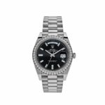 The Rolex 40 reference 228349RBR is a timeless icon, crafted in 18k white gold and adorned with a diamond-set bezel. Its bold black dial serves as the perfect contrast to the brilliance of the bezel, featuring applied white gold hour markers and the Day-Date??s signature day and date apertures at 12 and 3 o??clock.The 40mm case offers a refined presence, while the integrated President bracelet, also in white gold, ensures both comfort and prestige.