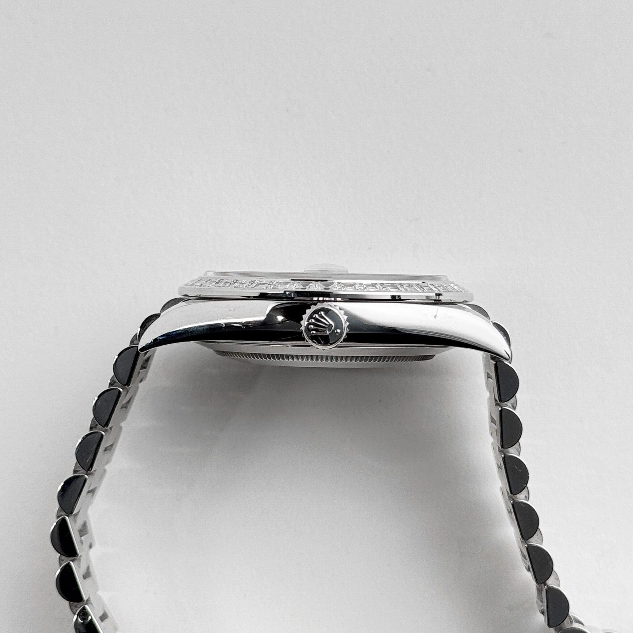 The standout feature is the mesmerizing ice blue dial, exclusive to Rolex platinum models, adorned with brilliant-cut diamond hour markers. The day window at 12 o??clock and date display at 3 o??clock seamlessly integrate functionality into the sophisticated design.