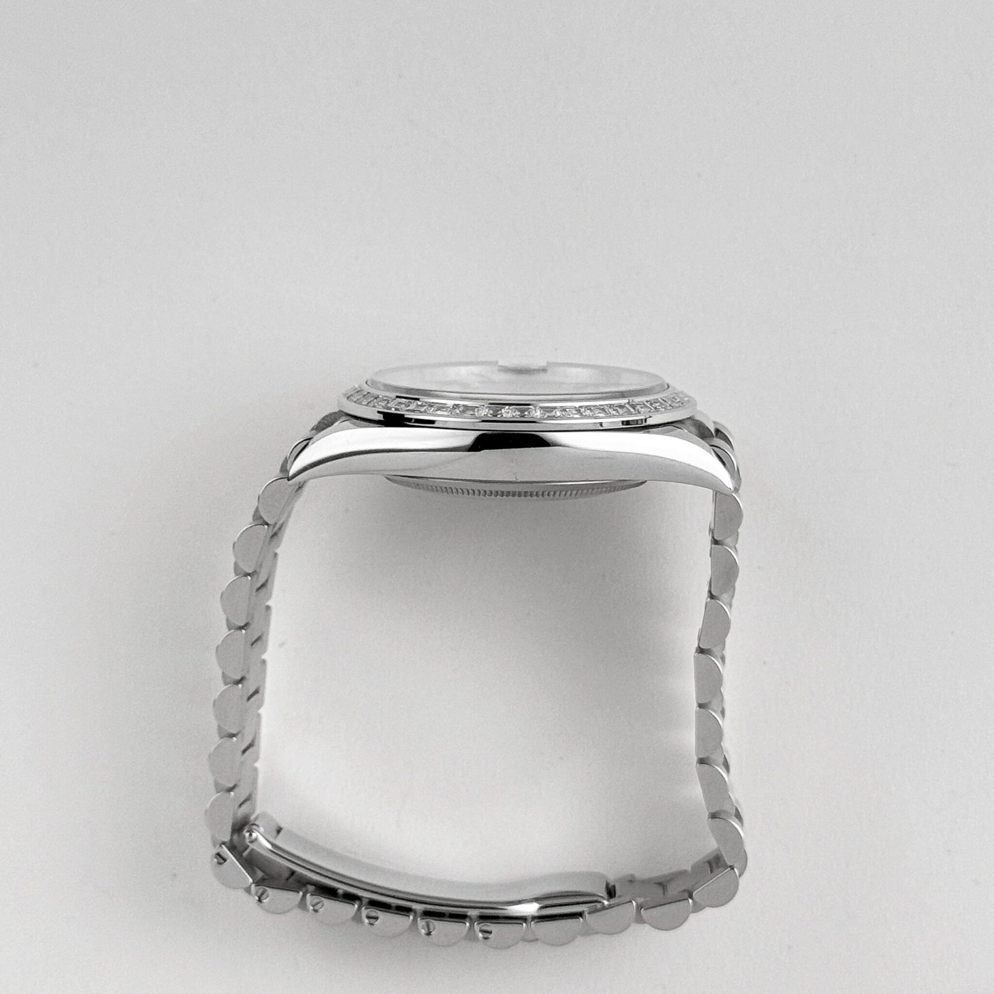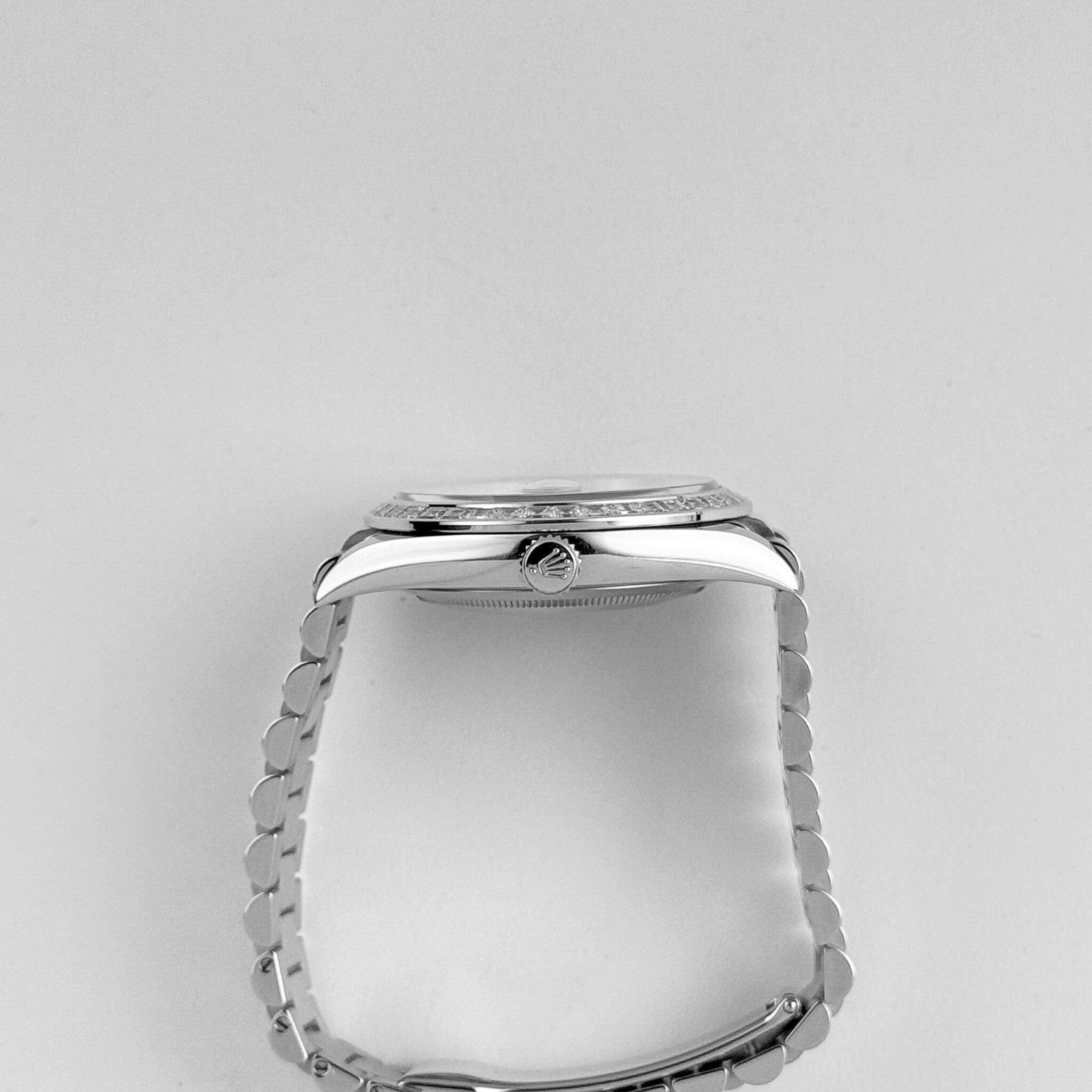 The standout feature is the mesmerizing ice blue dial, exclusive to Rolex platinum models, adorned with brilliant-cut diamond hour markers. The day window at 12 o??clock and date display at 3 o??clock seamlessly integrate functionality into the sophisticated design.