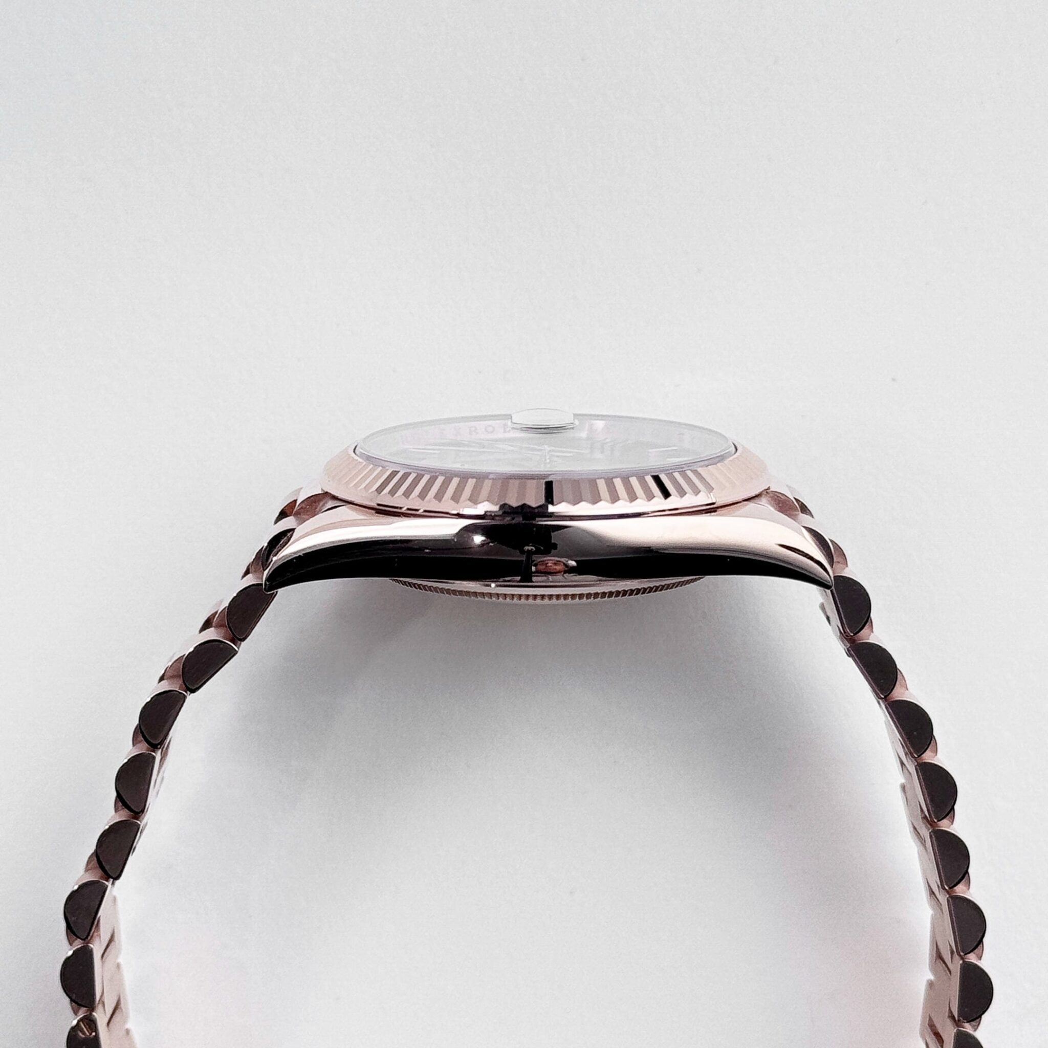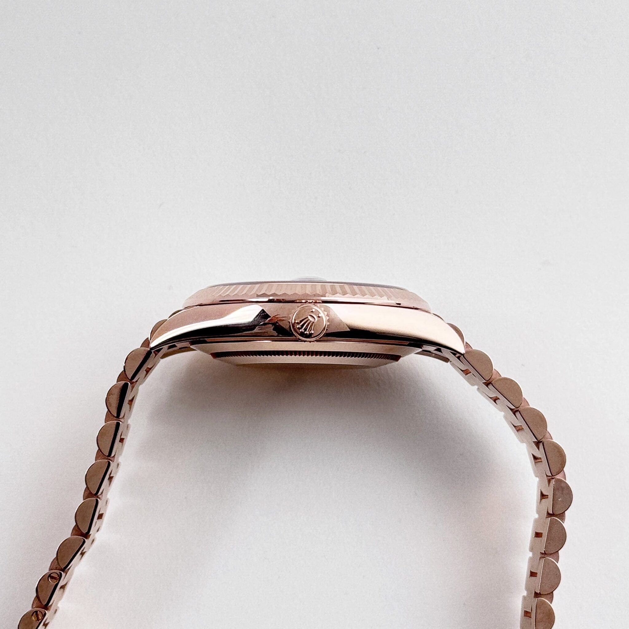 The?Rolex 228235?in?18k rose gold?is a statement of timeless luxury and refined craftsmanship. Its?40mm case exudes warmth and sophistication, featuring Rolex??s signature fluted bezel that enhances its elegant profile. The watch is paired with the prestigious?President bracelet, designed for superior comfort and an unmistakable presence on the wrist.