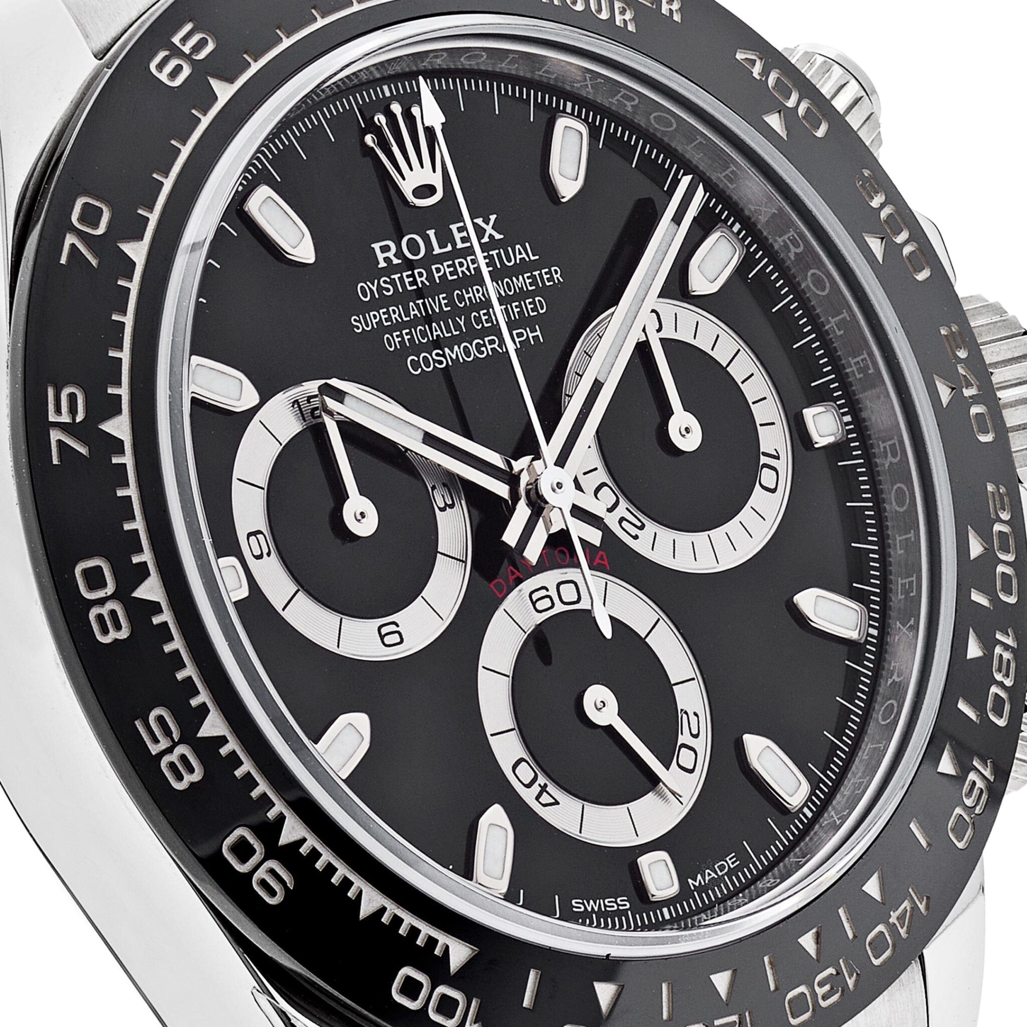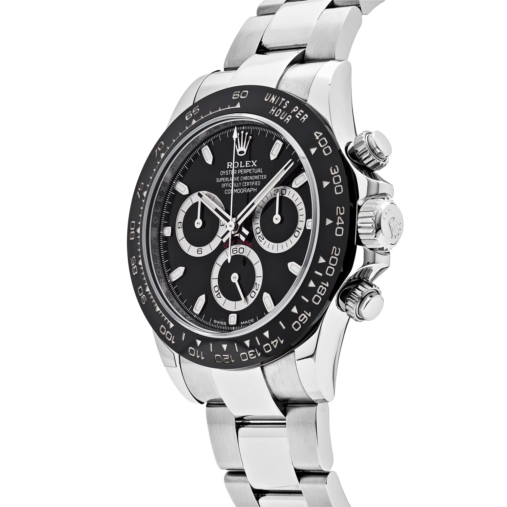 The Rolex 116500LN is designed in 40mm stainless steel with a black dial and styled on an Oyster bracelet. Luminous hour markers and hands include a Chromalight display for optimal legibility. The bezel is engraved with a tachymetric scale and hosts the high-performance Chronograph. This grail can time a speed of up to 400 kilometers per hour and remains seen as the epitome of functionality meeting fashion.