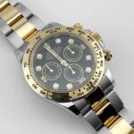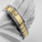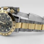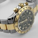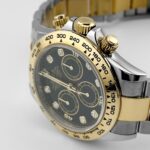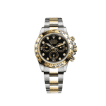The black dial is adorned with brilliant-cut diamond hour markers, adding a touch of opulence to its bold aesthetic. The chronograph subdials??30-minute, 12-hour, and running seconds??are highlighted with yellow gold accents, ensuring both practicality and visual harmony.?Fitted with the robust Oyster bracelet, featuring polished yellow gold center links and an Oysterlock clasp, this model delivers exceptional comfort and style.