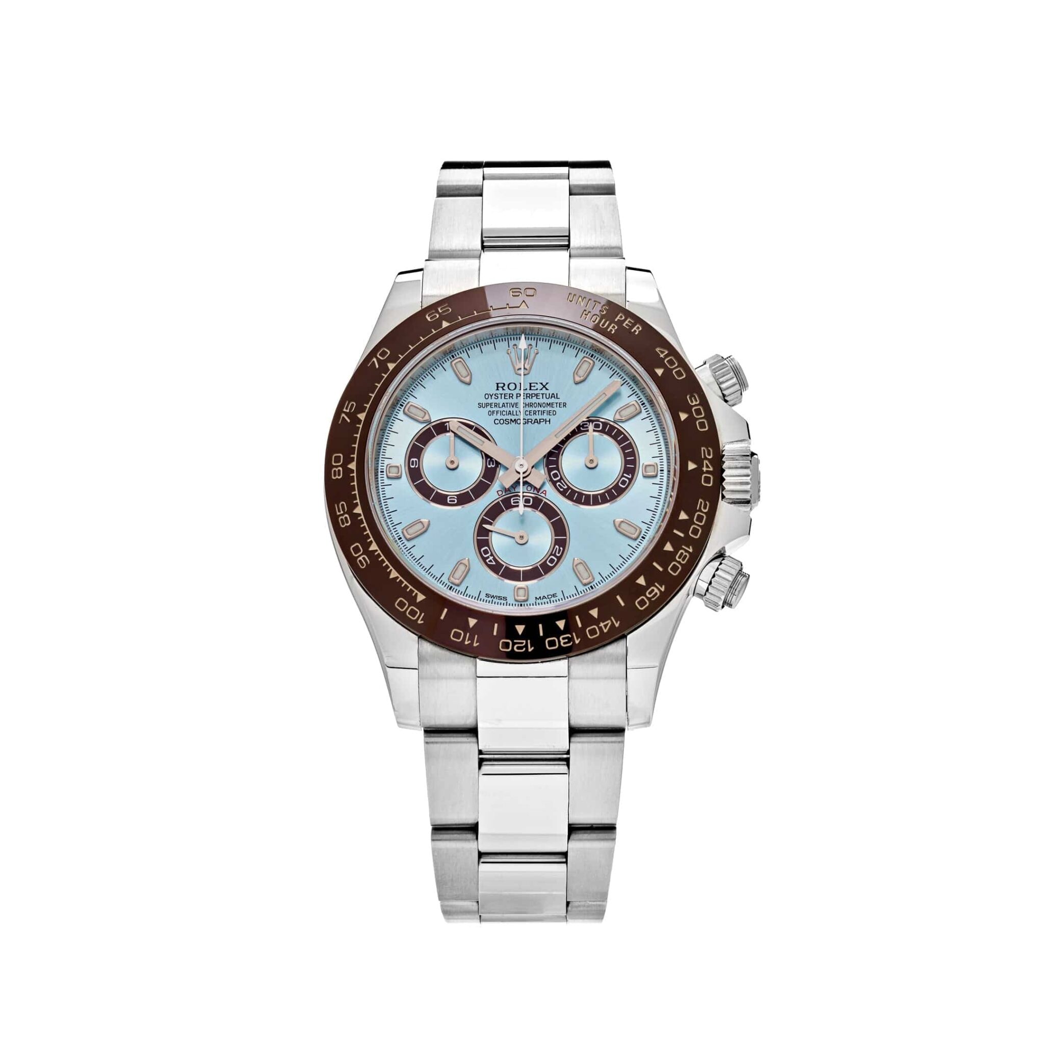 The standout feature of this model is its ice blue dial, a signature design reserved for Rolex??s platinum watches. The dial is enhanced with contrasting brown subdials for chronograph functionality, featuring 30-minute, 12-hour, and small seconds counters. Chromalight-filled markers and hands ensure optimal legibility in any lighting condition.