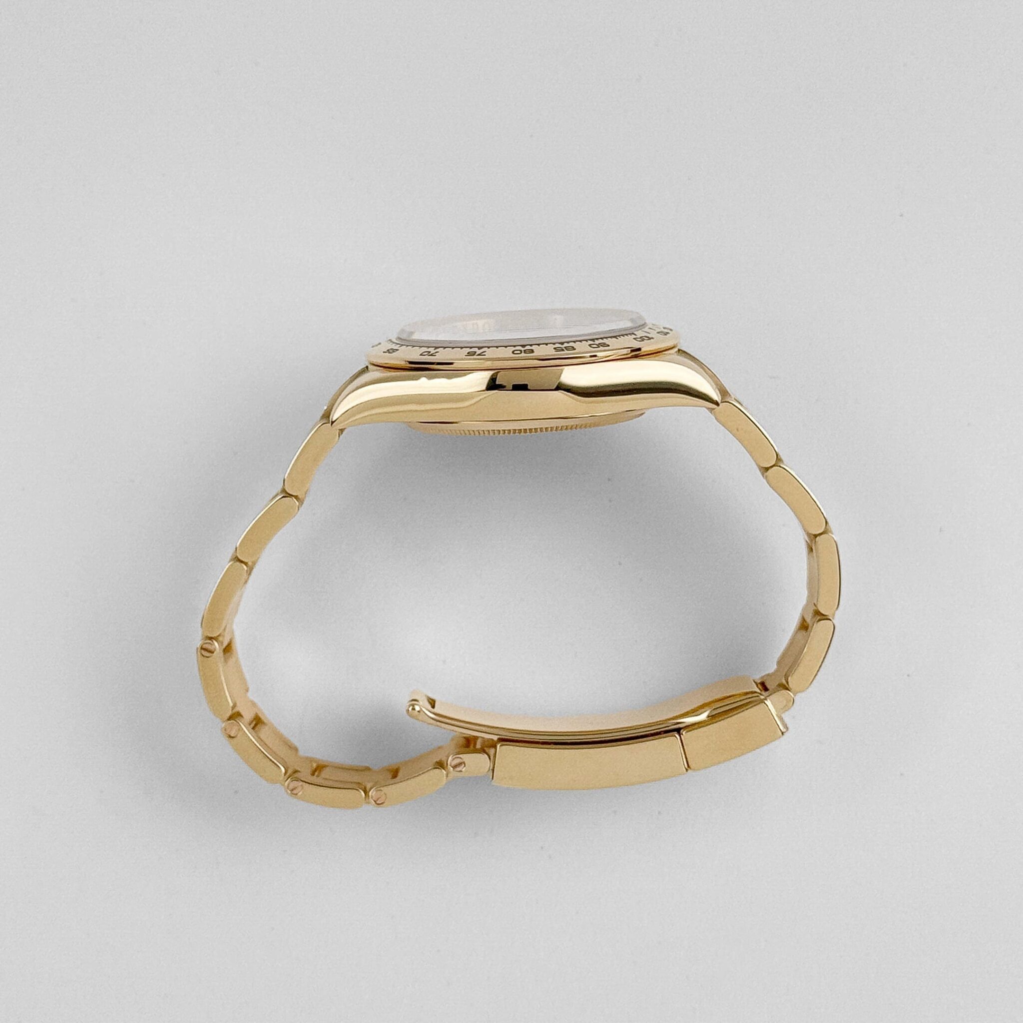 The Rolex 116508 is a bold and luxurious chronograph, crafted entirely in 18k yellow gold for a commanding and opulent presence. Its 40mm case is paired with a sleek black dial, featuring gold accents on the subdials that beautifully complement the case and add a touch of contrast. Luminous hour markers and hands ensure optimal legibility, while the design retains its timeless appeal.