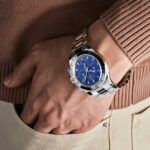 The standout blue dial is complemented by silver subdials and Chromalight-filled hands and hour markers, ensuring excellent legibility and a bold visual presence. The dial layout includes a 30-minute counter, 12-hour counter, and small seconds subdial, offering precise functionality for timing events.