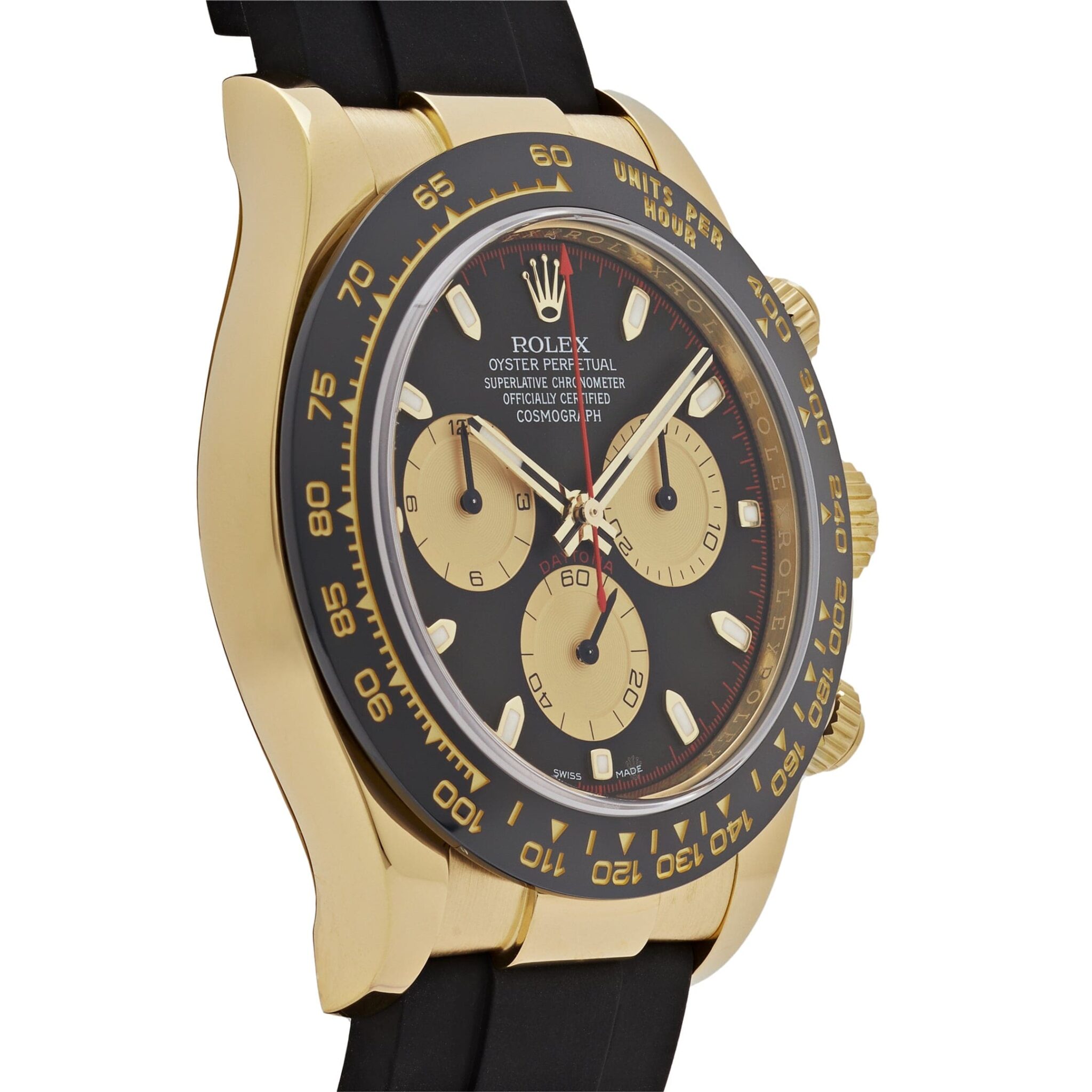 The black dial features vintage-inspired accents, including contrasting subdials reminiscent of the original Paul Newman Daytona models. The combination of gold accents and bold subdial outlines creates a timeless and highly collectible aesthetic.