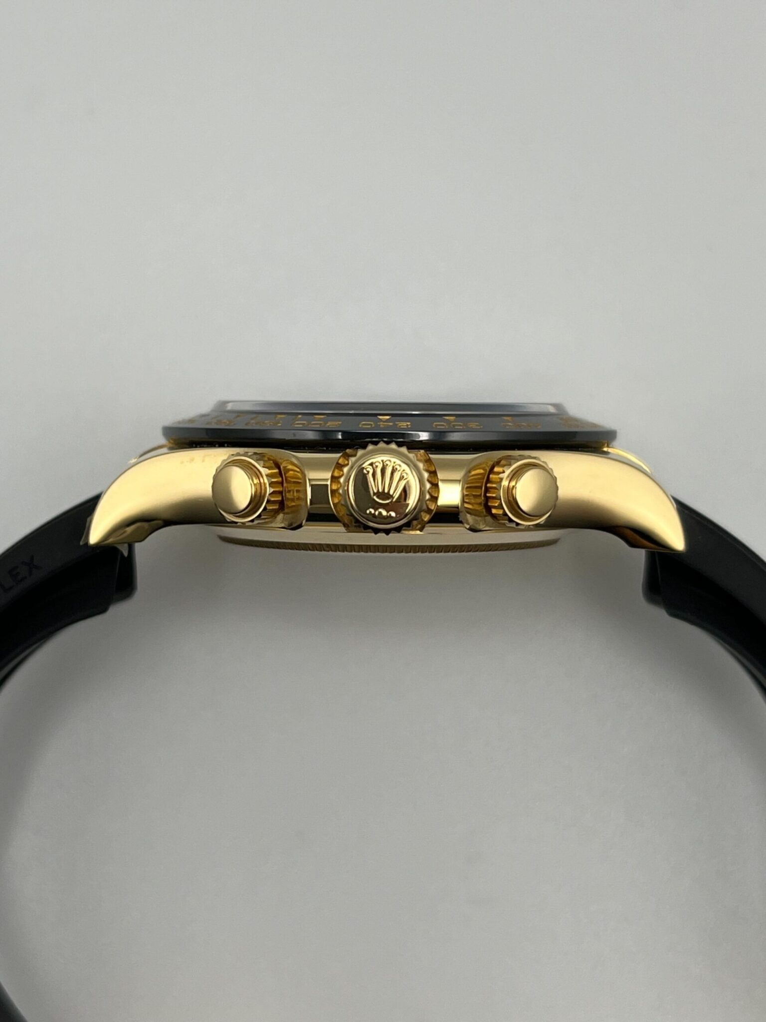 This Rolex 116518LN is designed in a 40mm 18k yellow gold case, a black bezel featuring a Tachymetric scale, and a black dial with matching sub-dials. The hour markers and hands work with Chromalight display to provide optimal legibility. It is housed on a black rubber strap with a folding clasp. Discover the pinnacle between form, function, and fashion.