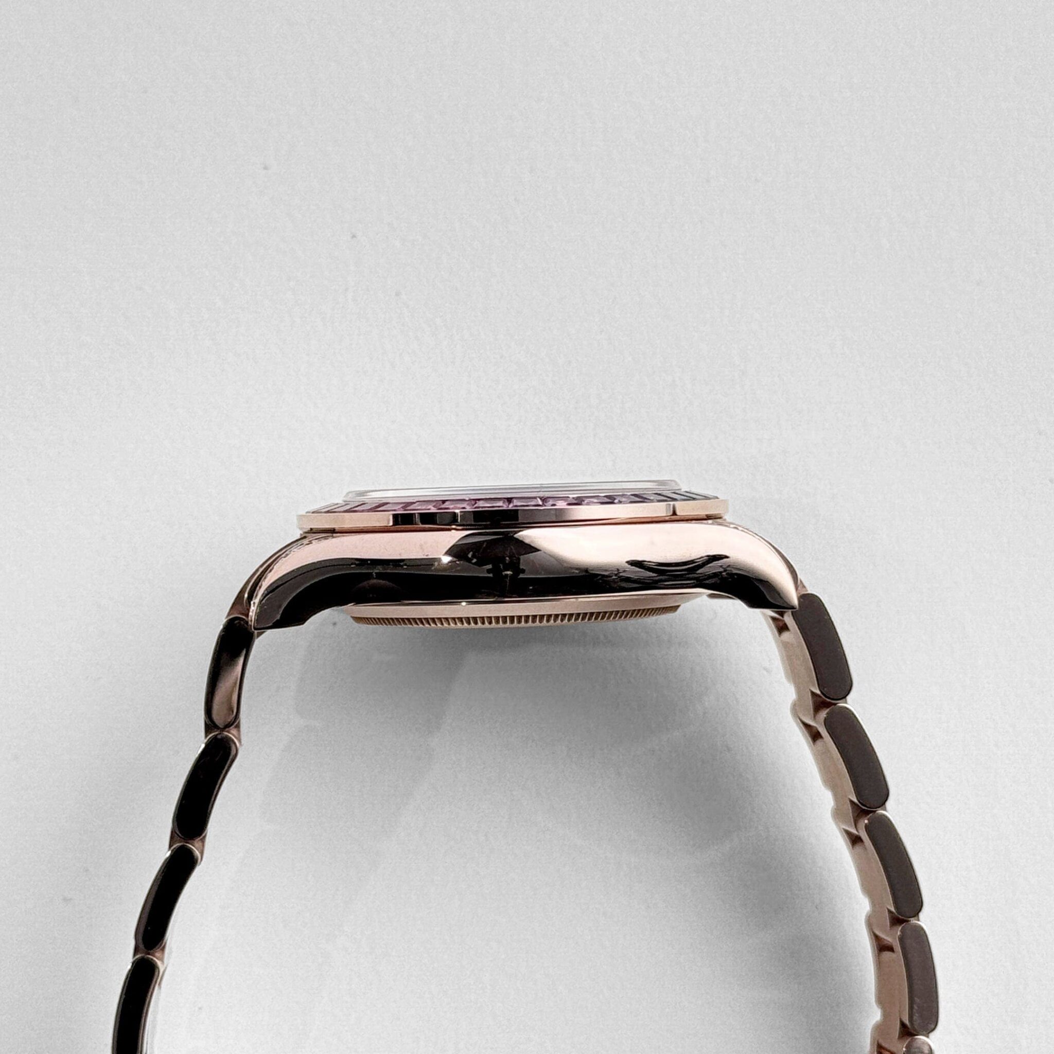 The?Rolex 116595RBOW “Rainbow”?is a breathtaking fusion of haute horology and high jewelry, transforming Rolex??s iconic chronograph into a dazzling statement piece. Crafted in?18k Everose gold, its?40mm case?is adorned with a mesmerizing?rainbow-colored sapphire bezel, meticulously set with a gradient of baguette-cut sapphires. The lugs and crown guards are further enhanced with brilliant-cut diamonds, adding an extra layer of brilliance to this already exceptional timepiece.