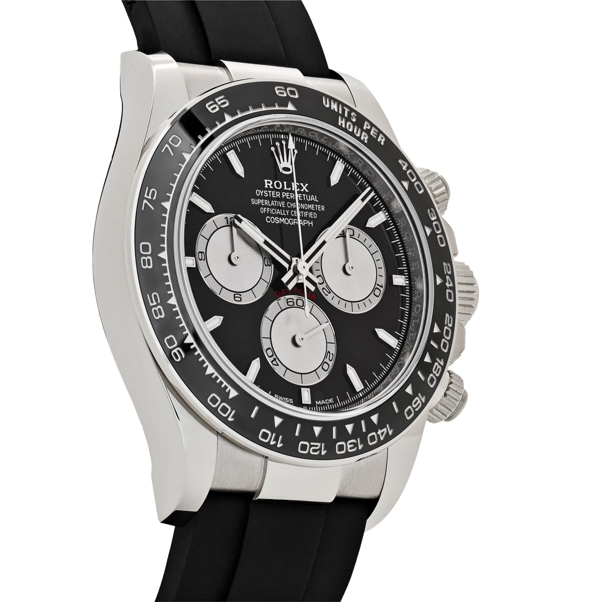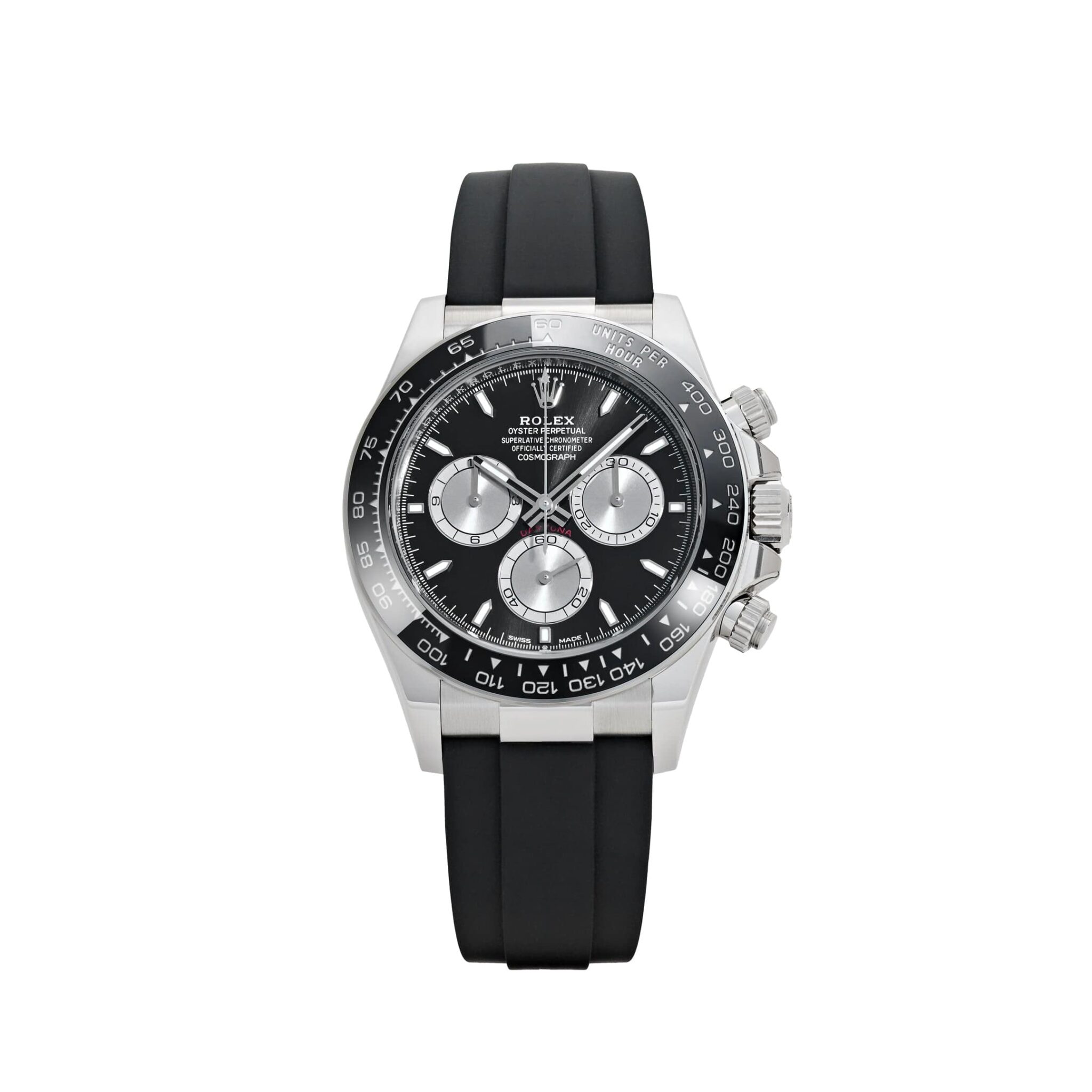 Fitted on a black Oysterflex bracelet with a white gold folding clasp, the watch maintains comfort and resilience while enhancing the modern aesthetic. This Daytona is powered by the Rolex caliber 4131 movement, delivering precision chronograph function, excellent shock resistance, and a robust power reserve. A refined and dynamic piece, the 126519LN is ideal for collectors who want the sophistication of precious metal with the sporty performance the Daytona is known for.