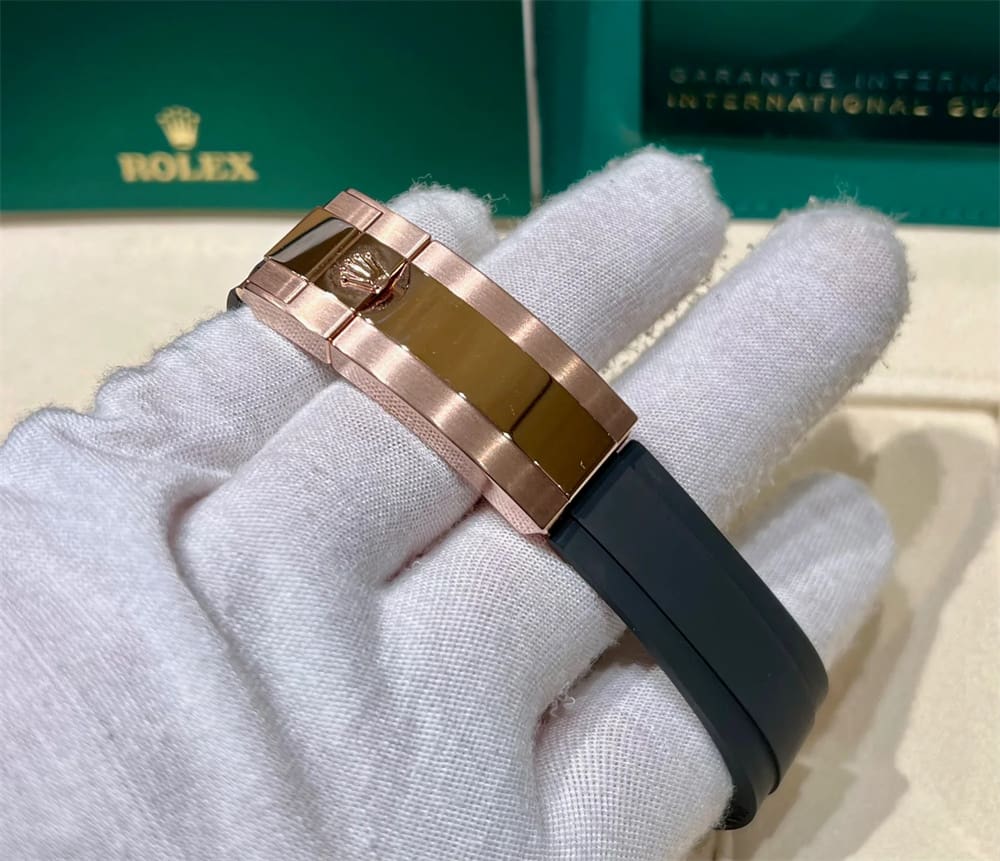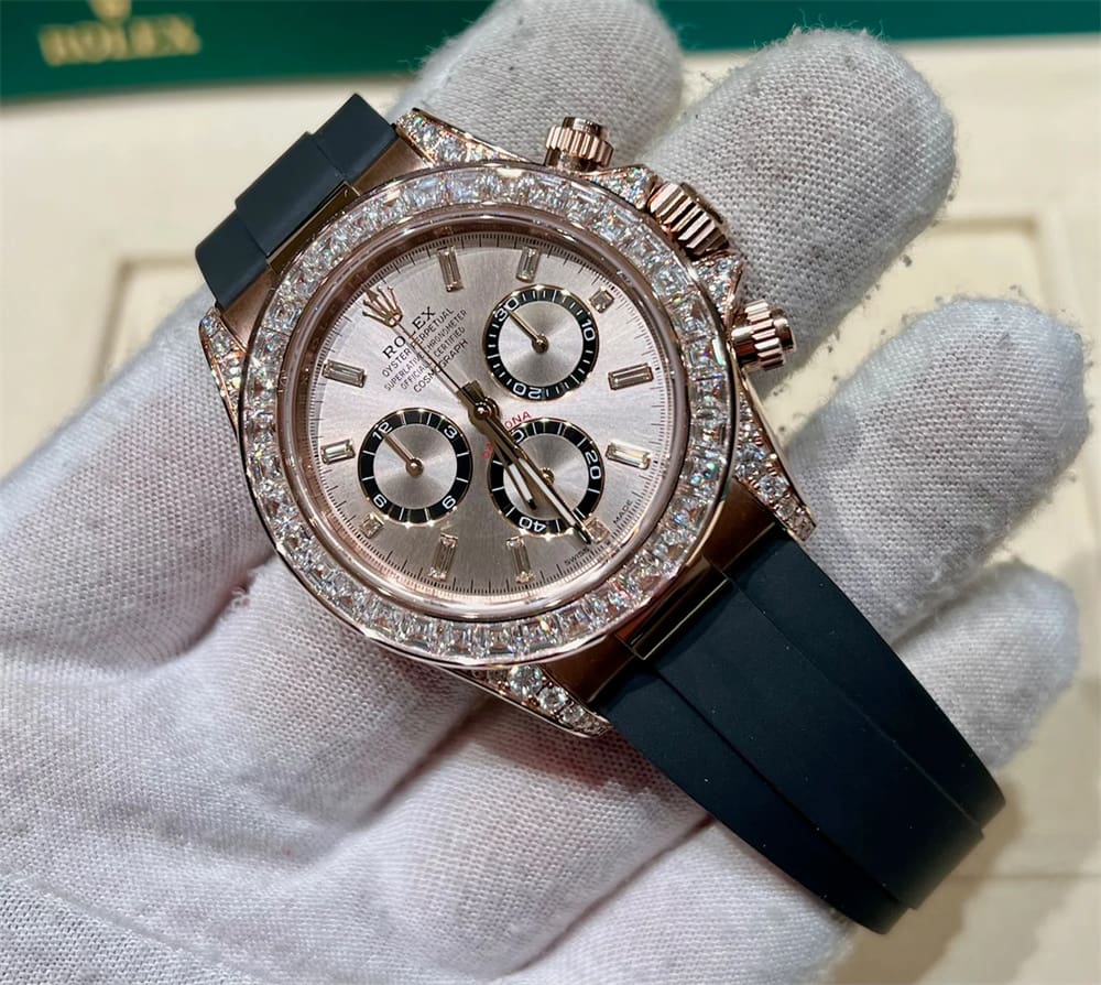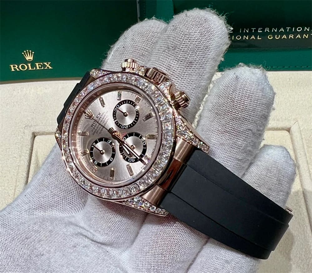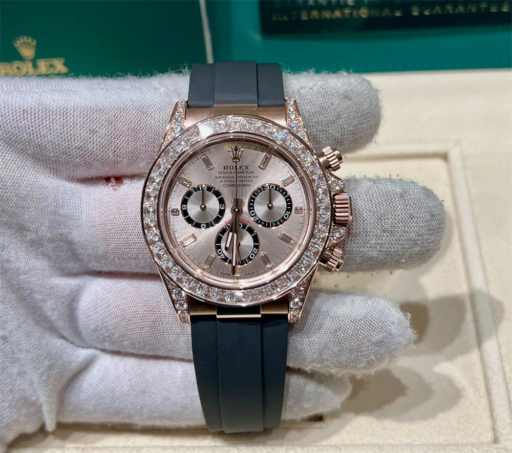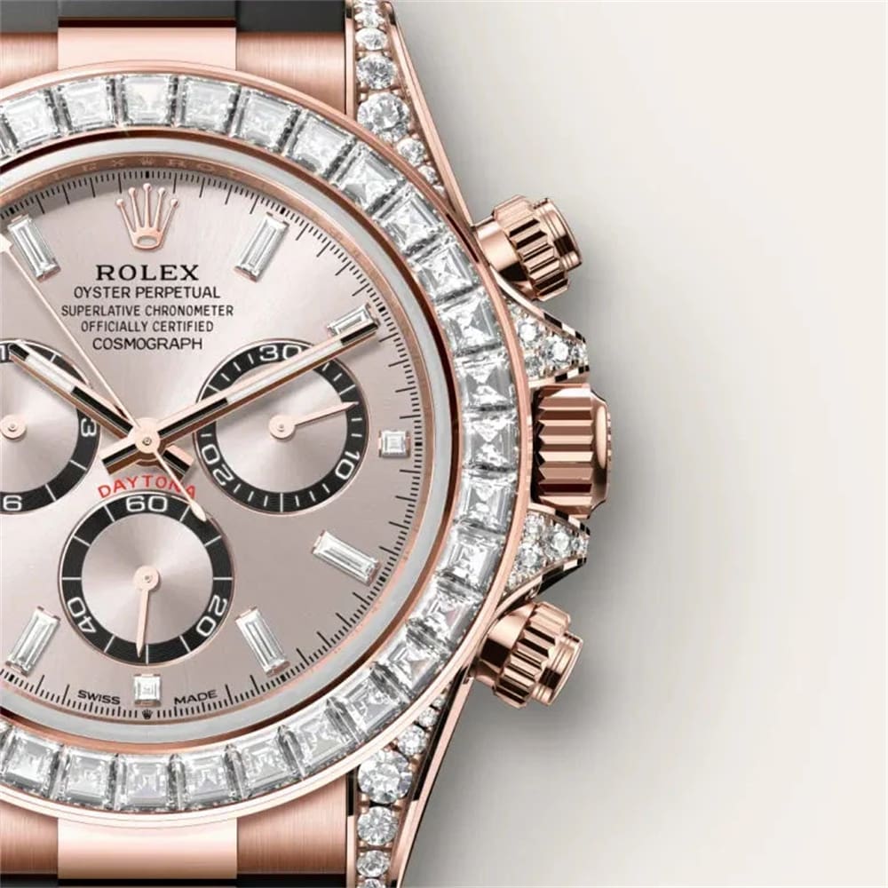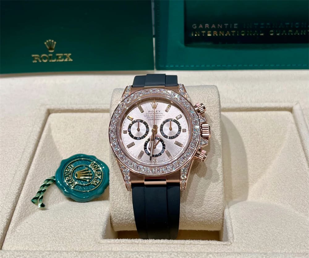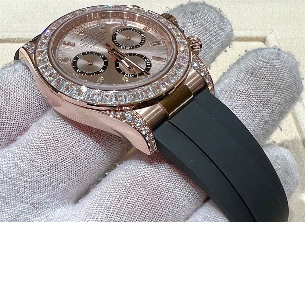 The dial is finished in a refined sundust tone, complemented by rose gold subdials and diamond hour markers that shimmer with elegance. The signature chronograph counters at 3, 6, and 9 o??clock maintain the model??s racing heritage, while the black lacquered minute track and subtle contrast elements offer high legibility. Paired with Rolex??s innovative Oysterflex bracelet, made of flexible titanium and nickel alloy blades encased in high-performance elastomer, the watch delivers both luxury and comfort on the wrist.