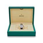 The Rolex Cosmograph 126589RBR is a striking blend of luxury and performance, crafted in 18k white gold and featuring a luminous mother of pearl dial. Known for its unique iridescence, each mother of pearl dial is one-of-a-kind, reflecting light beautifully and giving this model a distinct, refined appeal. Complementing the dial, diamond hour markers add a subtle elegance while maintaining the functionality of the Daytona’s chronograph design.??40 mm??