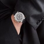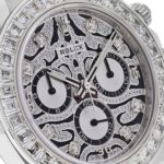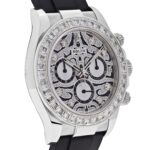 The Rolex 116589TBR, famously dubbed the “Eye of the Tiger,” is a dazzling interpretation of the iconic Daytona chronograph. Crafted in 18k white gold, its 40mm case exudes luxury, complemented by a bezel adorned with brilliant-cut diamonds, creating an unforgettable visual impact.