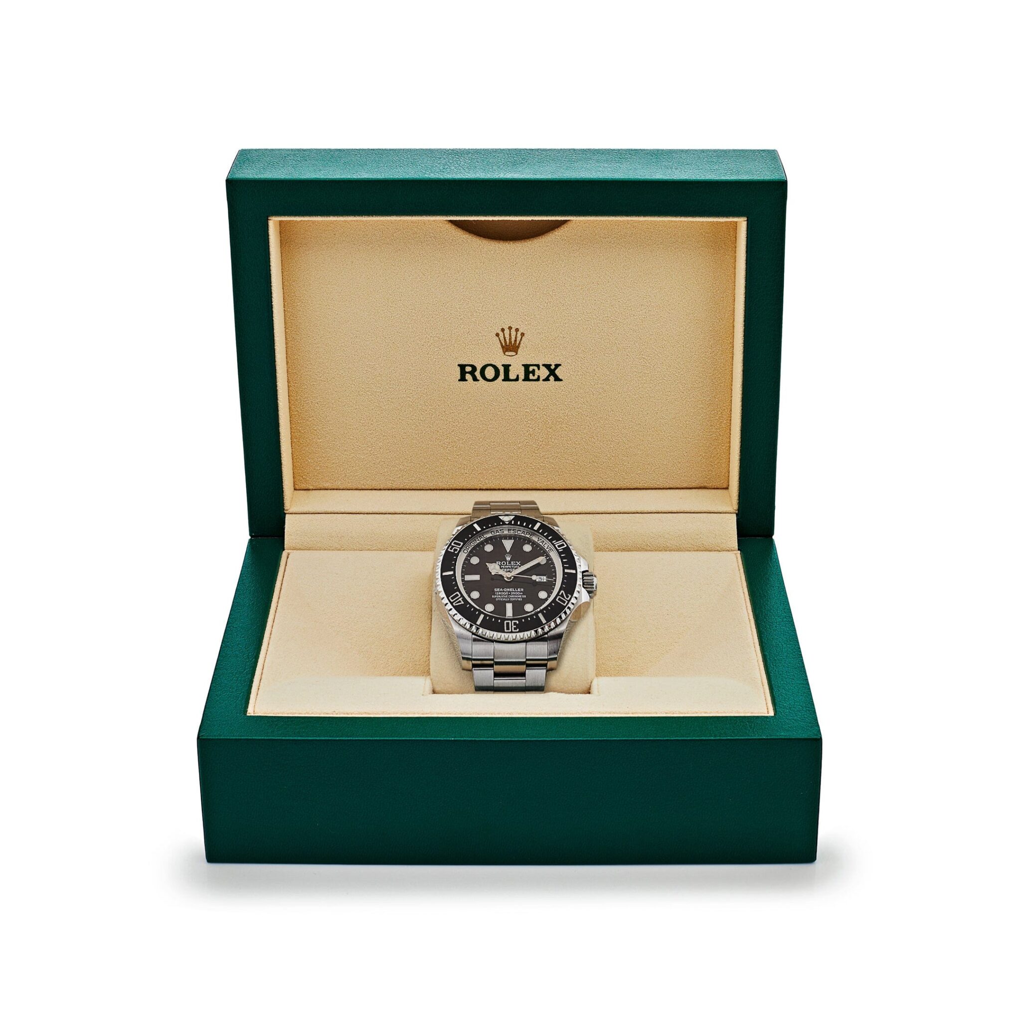 The black dial features bold Chromalight hour markers and hands, ensuring exceptional legibility even in the darkest underwater environments. The date window at 3 o??clock, magnified by Rolex??s signature Cyclops lens, adds practicality without compromising the sleek design.