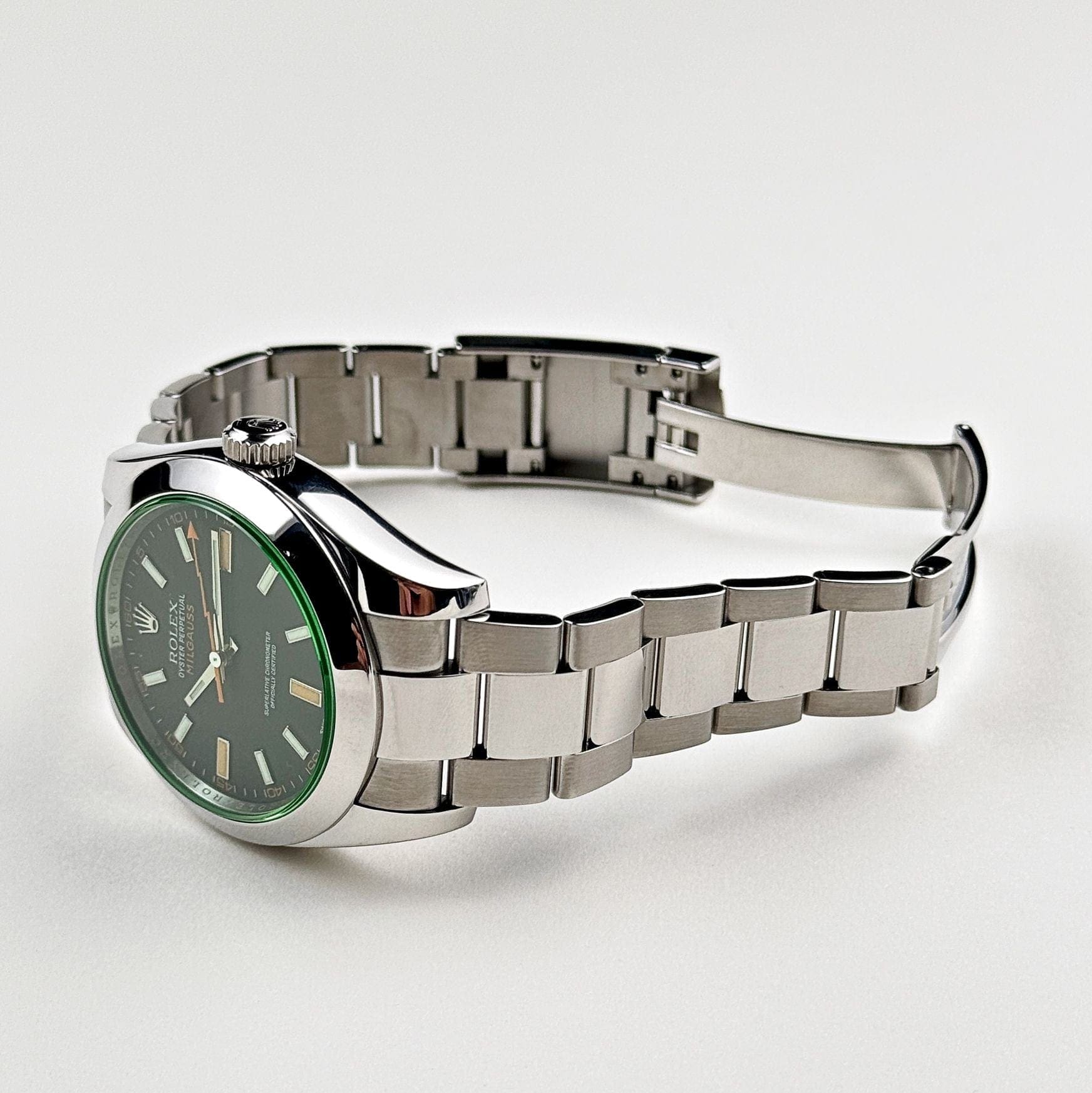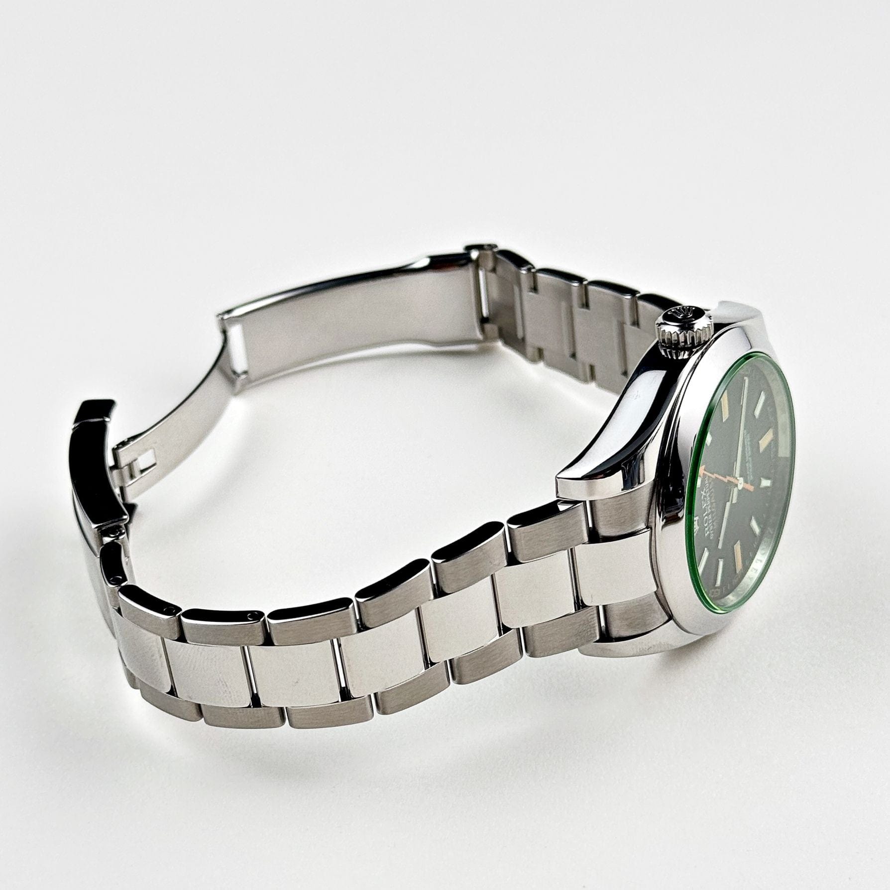 The watch??s unique green-tinted sapphire crystal sets it apart, giving the dial a subtle, otherworldly glow while remaining scratch-resistant. Paired with an Oyster bracelet in stainless steel, the 116400GV combines robustness with comfort, making it a versatile timepiece suited for everyday wear.