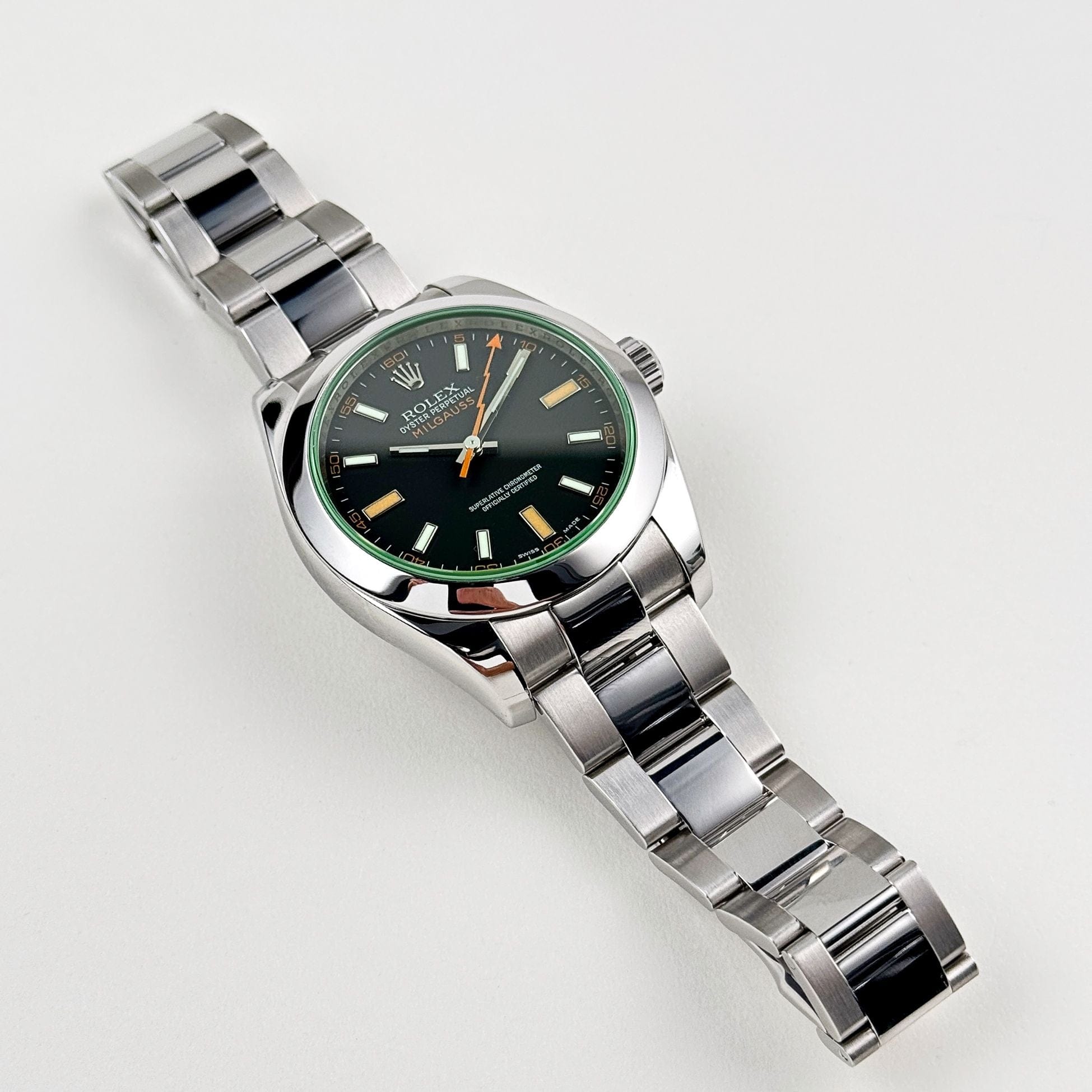 The Rolex 116400GV is a distinctive model that embodies both style and scientific innovation, crafted in durable stainless steel. This watch features a sleek black dial accented by orange highlights and the iconic lightning bolt-shaped seconds hand, a nod to its anti-magnetic properties. Designed for professionals working in environments with strong magnetic fields, the Milgauss is resistant to magnetic interference up to 1,000 gauss, ensuring optimal performance and precision.