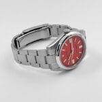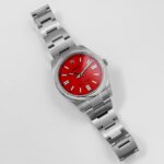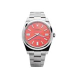 The Rolex 124300 is a vibrant and contemporary timepiece that celebrates simplicity and style. Crafted in stainless steel, its 41mm case features a sleek domed bezel, offering a clean and modern aesthetic. The striking red lacquered dial is the highlight of this model, providing a bold and energetic presence, while luminous baton hour markers and hands ensure excellent legibility.