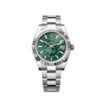 The Rolex 336934 is a remarkable blend of innovation and elegance, crafted for global travelers. Featuring a 42mm stainless steel case, this model is highlighted by a vibrant green sunburst dial, complemented by luminous baton hour markers and hands for excellent readability.