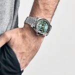 The sunburst green dial is the standout feature, offering a vibrant yet sophisticated look. The dial includes a 24-hour off-center ring for tracking a second time zone, a discreet date window at 3 o??clock magnified by the Cyclops lens, and the signature month indicator around the hour markers, ensuring practicality without compromising style.