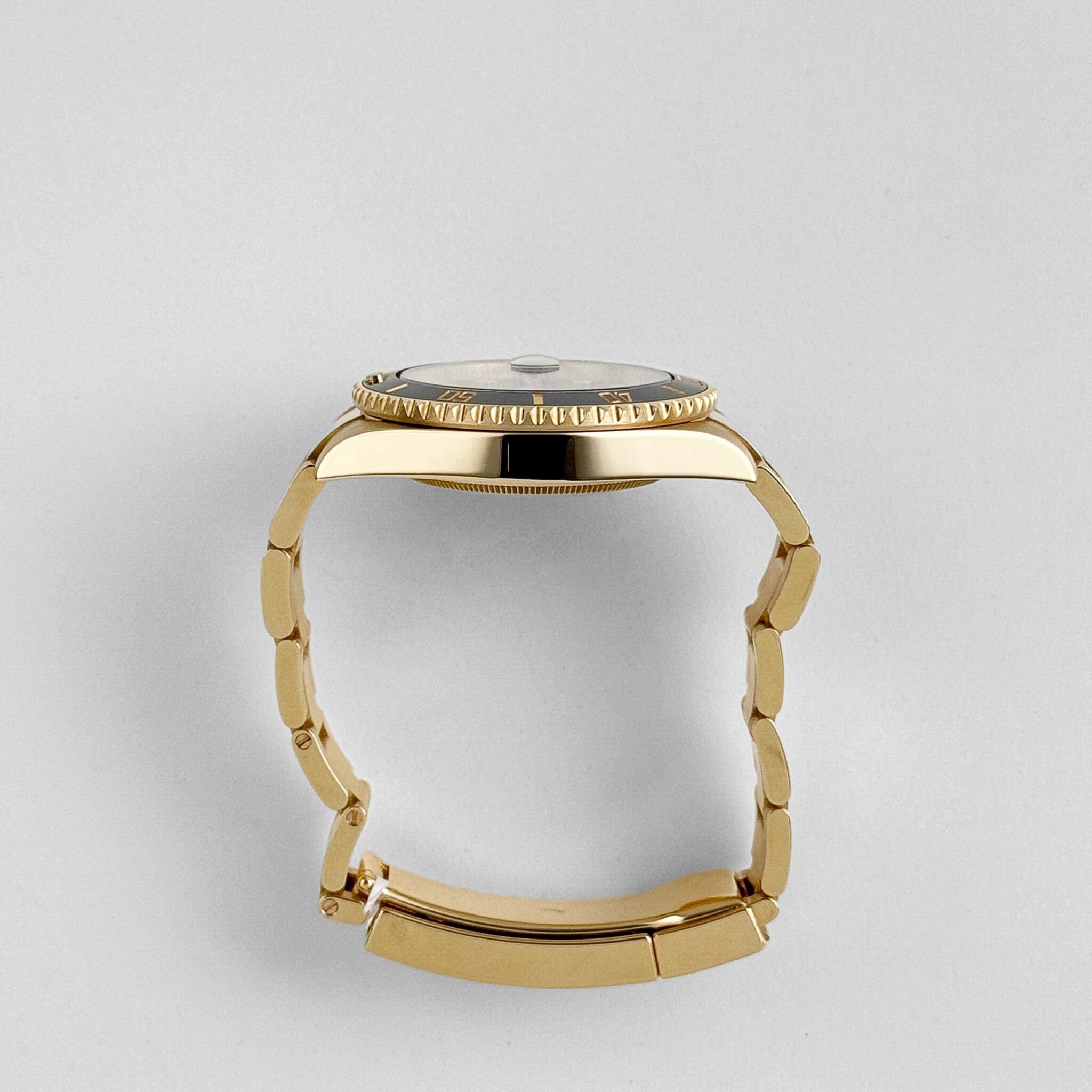 The dial features luminous hour markers and hands, ensuring readability in low-light conditions, with a Cyclops lens over the date window at 3 o??clock for easy viewing. The Oyster bracelet, also in yellow gold, features a Glidelock extension system, allowing adjustments to fit over a wetsuit.