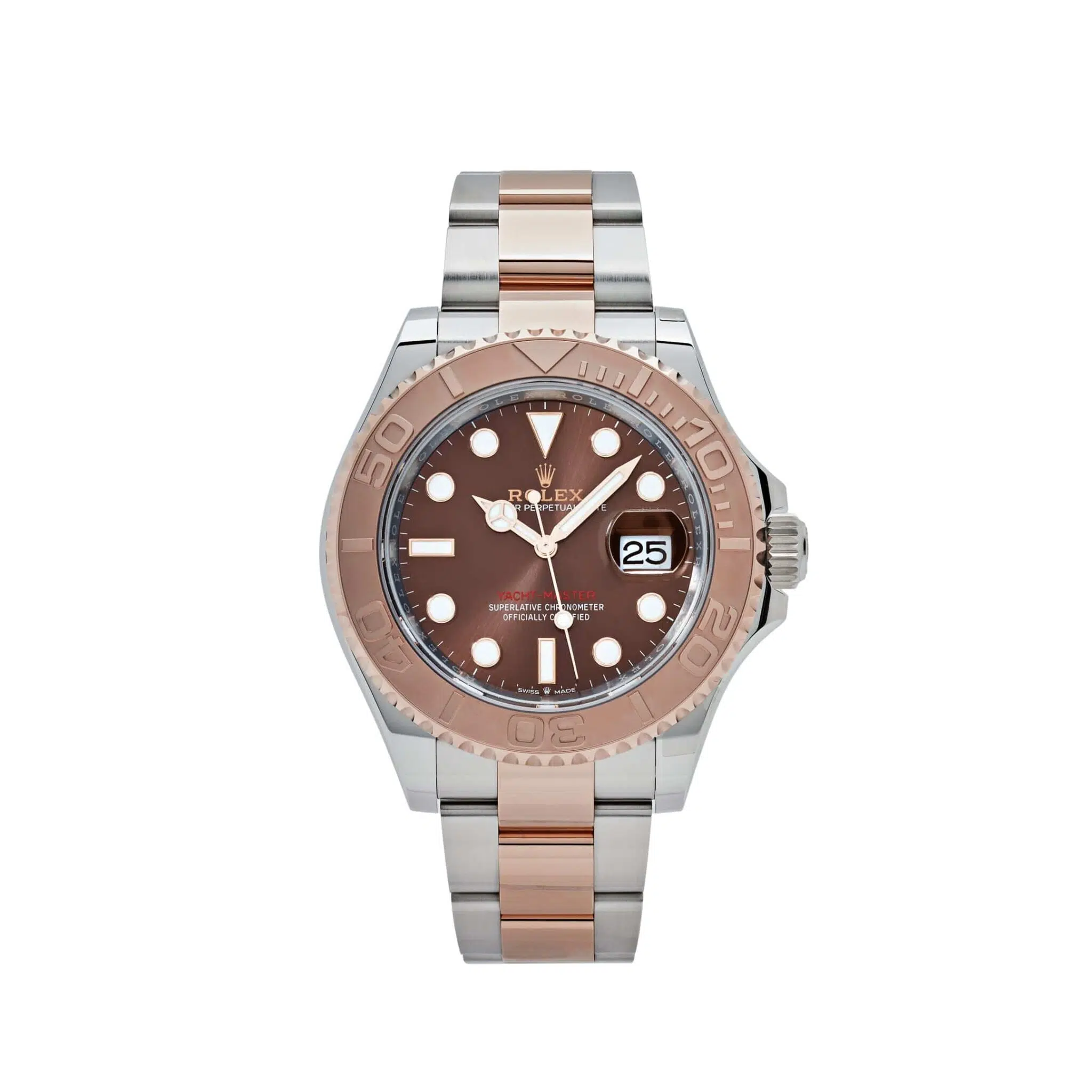 The Rolex40 126621 combines rugged luxury with nautical refinement. This two-tone model blends stainless steel and rose gold across the case and bracelet, offering a sophisticated contrast to the rich sunburst brown dial. Large hour markers and hands in 18k rose gold provide legibility, while the bidirectional rotatable bezel in matching rose gold is finished with a polished insert for added visual depth.