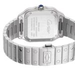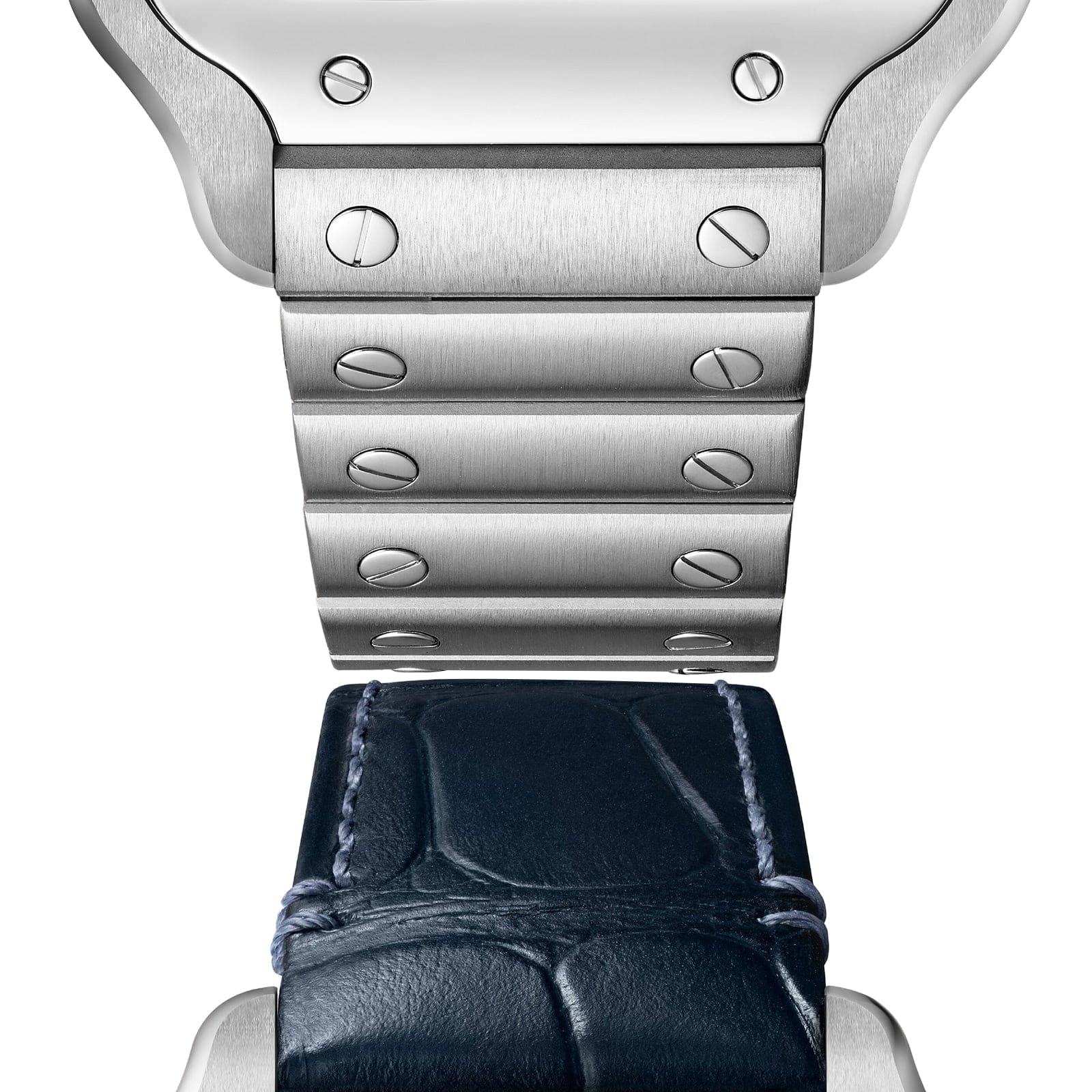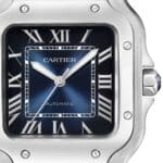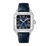 Santos de Cartier – where precision meets minimalism A tribute to aviation innovator Alberto Santos-Dumont Encased in a balanced square steel frame Graduated blue dial with polished steel sword-shaped hands Powered by the calibre 1847 MC self-winding mechanical movement for flawless precision SIGNATURE DESIGN First crafted in 1904, the Santos de Cartier collection honours Alberto Santos-Dumont, the visionary aviator behind the original inspiration. With its focus on form, minimalist elegance, precise proportions, and refined detail, the collection is defined by its square case, softened by rounded corners and accented with exposed screws for a bold, functional aesthetic. Although the collection has been updated over the years, it retains the key elements that make it instantly recognisable to aviation enthusiasts and watch collectors alike. ATTENTION TO DETAIL This timepiece is housed in a rounded square steel case with visible screws and a distinctive 7-sided crown featuring a striking faceted blue spinel. The deep blue sunray dial exudes sophistication, complemented by steel Roman numerals and matching sword-shaped hands. Complete with two straps – one in blue alligator leather and the other in polished steel – this watch can be easily customised to reflect your personal sense of style. Water resistant to 10 bar (100 metres) and powered by the calibre 1847 MC self-winding mechanical movement, this timepiece balances functionality with timeless design.